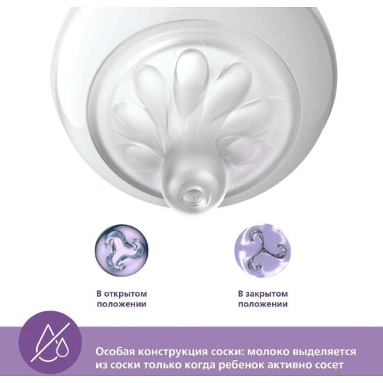 | Дополнительная информация | Конструкция соски позволяет избежать случайное проливание молока. Соска, которая не только ощущается, но и работает как мамина грудь. Защищает от возникновения колик и дискомфорта. |