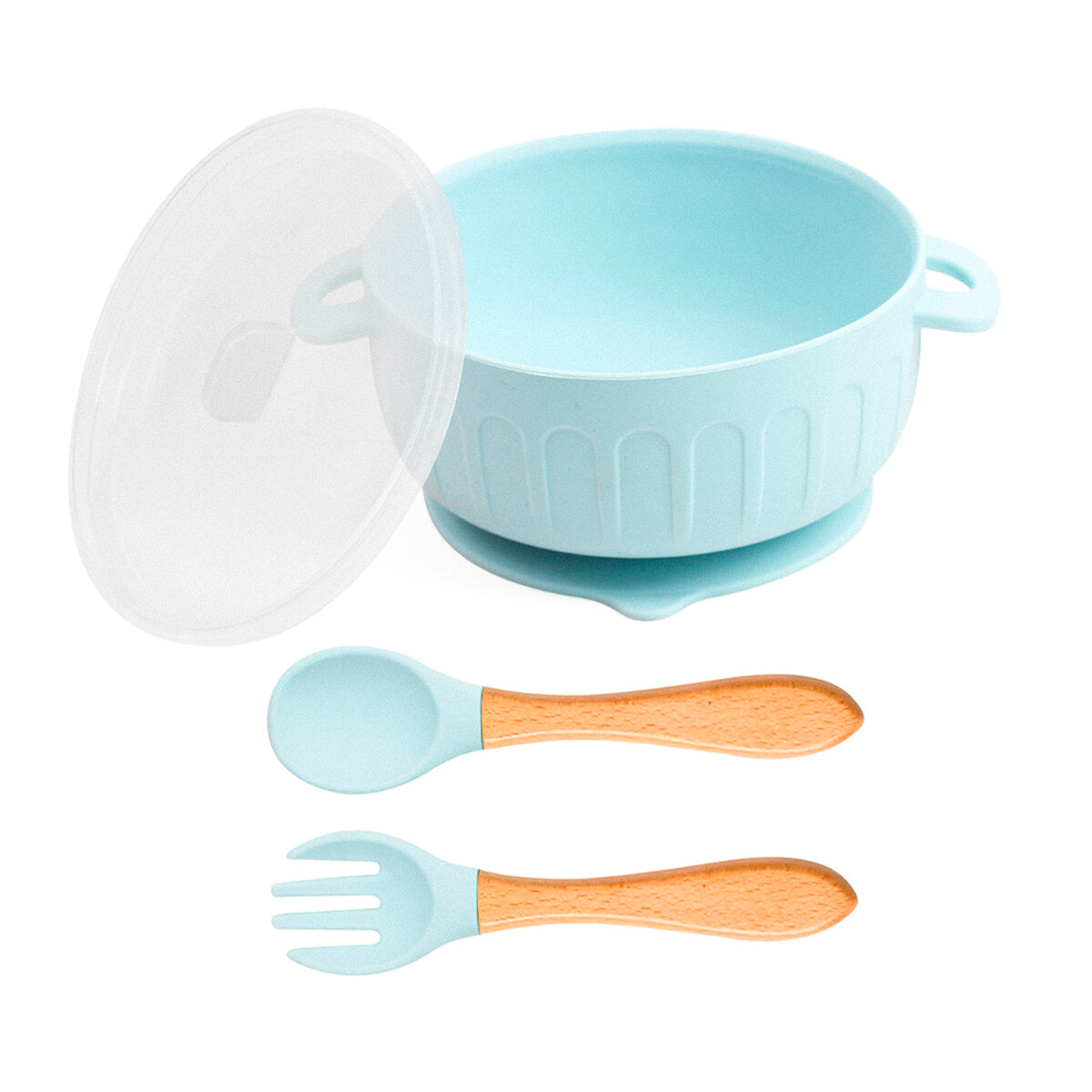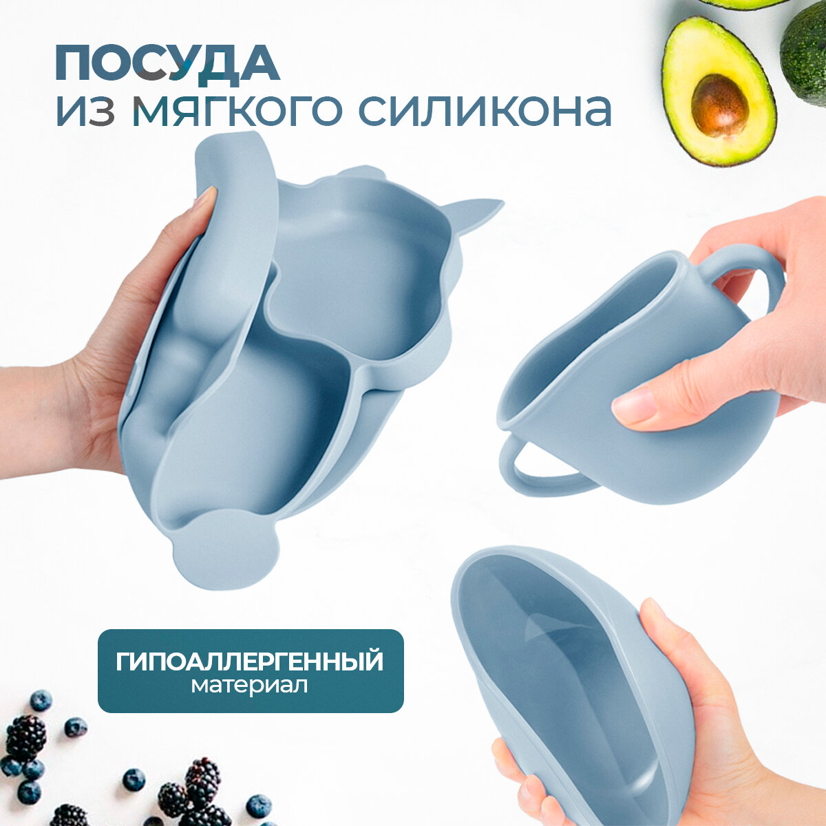 Набор максимальный (9 предметов) силиконовой детской посуды для кормления малыша Plates светло-синий