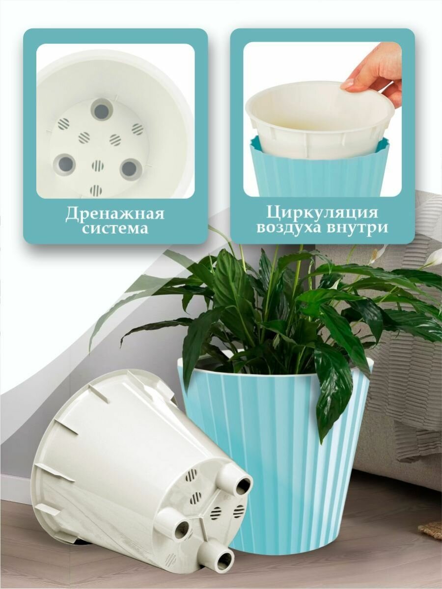 Горшок пластиковый для комнатных растений, цветов InGreen Sand диаметр 32 см объем 15,8 л c дренажной вставкой и кашпо на колесиках небесный
