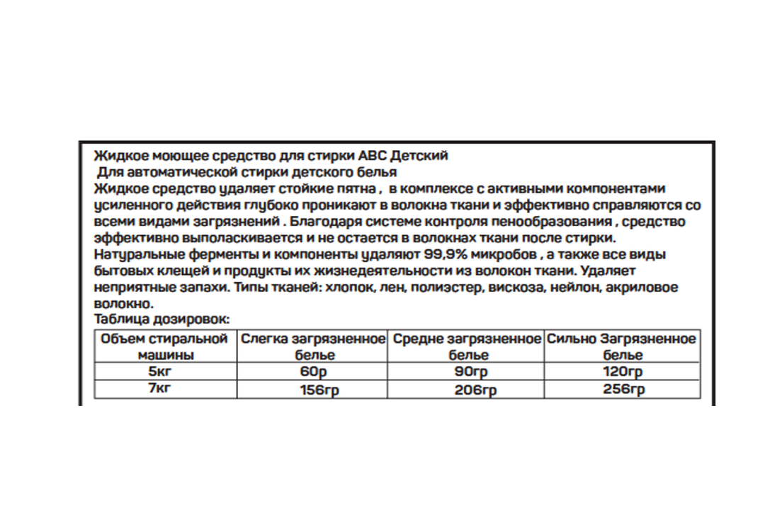 | Эффект | антибактериальный / антистатический / восстановление цвета / отбеливание / придание мягкости / устранение неприятных запахов |