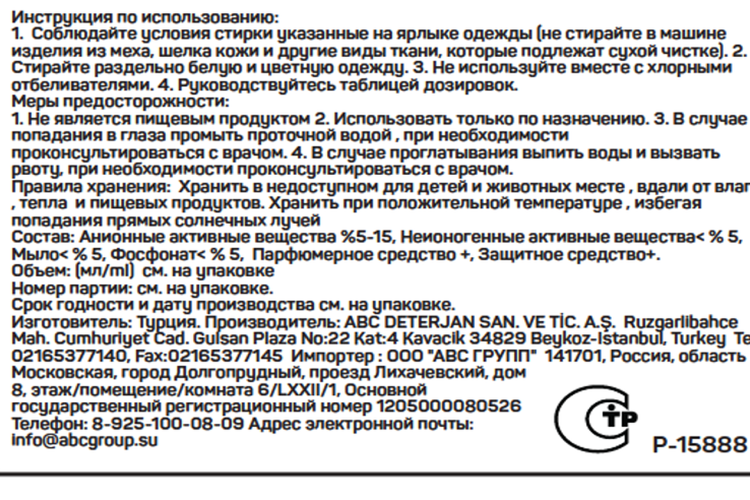 | Содержит | ПАВ / антибактериальный компонент / глицерин / кондиционер / консерванты / лимонная кислота / отбеливатель / пятновыводитель / фосфонат / энзимы |