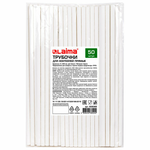 Трубочки для коктейлей бумажные, прямые, 6х205 мм, белые, комплект 50 штук, LAIMA, 608366