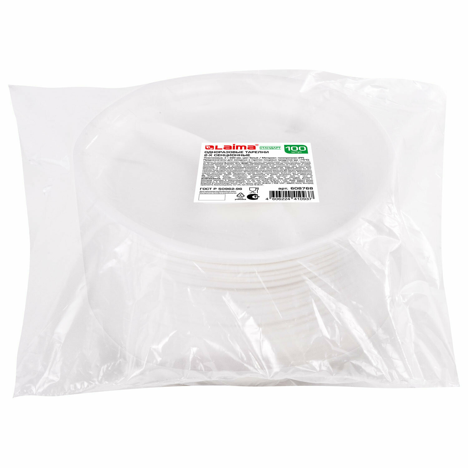 Одноразовые тарелки 2-х секционные комплект 100 шт. 220 мм, белые, ПП, холодное/горячее, LAIMA стандарт, 608768
