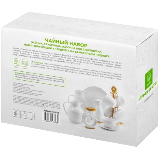 | Дополнительная информация | Набор "Птички на ветке" - чайник 21,5х13,5х13,5 см 900 мл, внутри чайника дырочки в носике, сахарница 12х12х12 см с дер. крышкой и с ложкой, 620 мл, высота без крышки 9 см, вазочка под зубочистки + набор для специй 2 предмета 6х6х5 см 75 мл - каждая, на деревянном подносе с ручками 29,5х20х5,5 см |