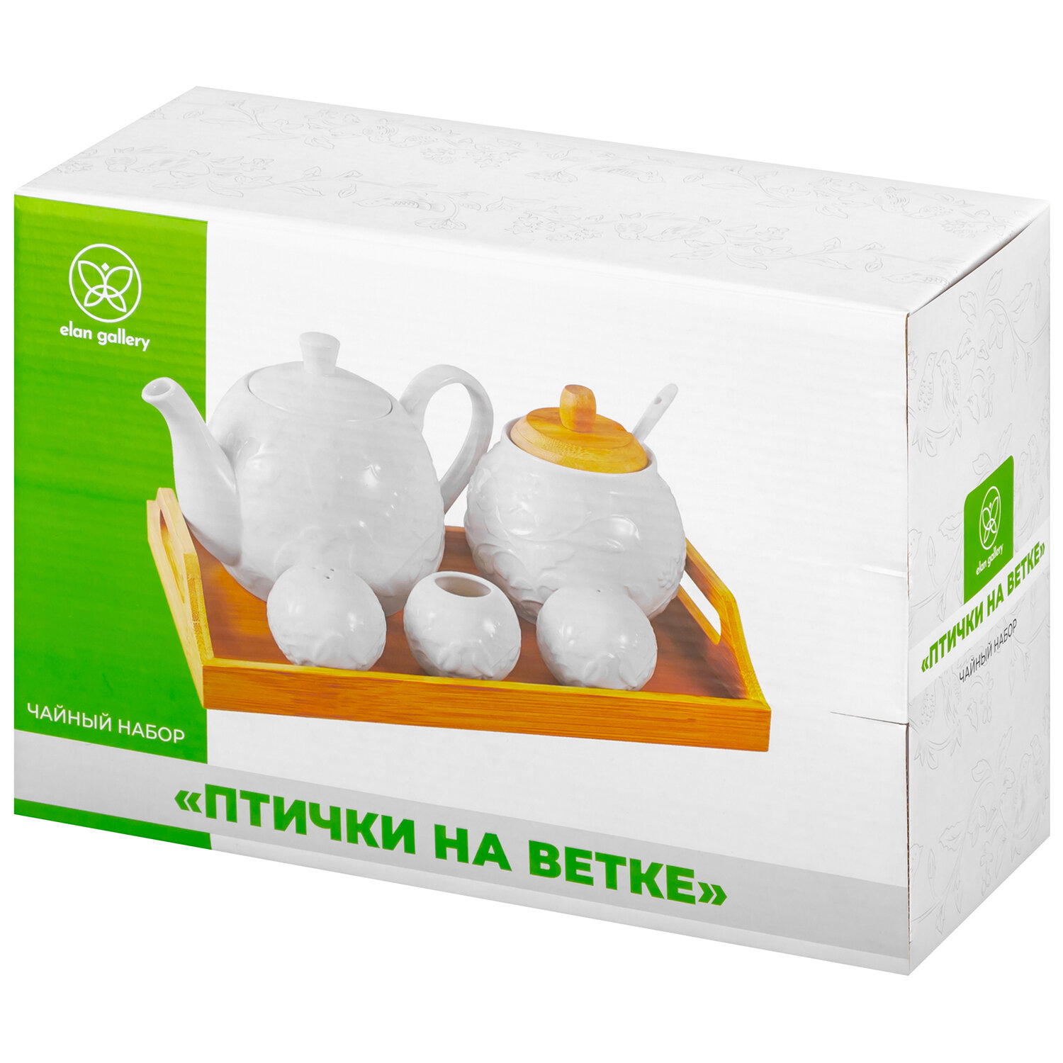 Набор - чайник, сахарница, вазочка под зубочистки, перечница, солонка Elan Gallery Птички на ветке, на подносе с ручками интересное: