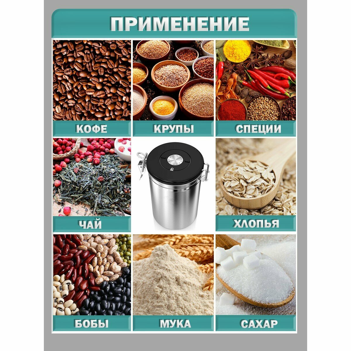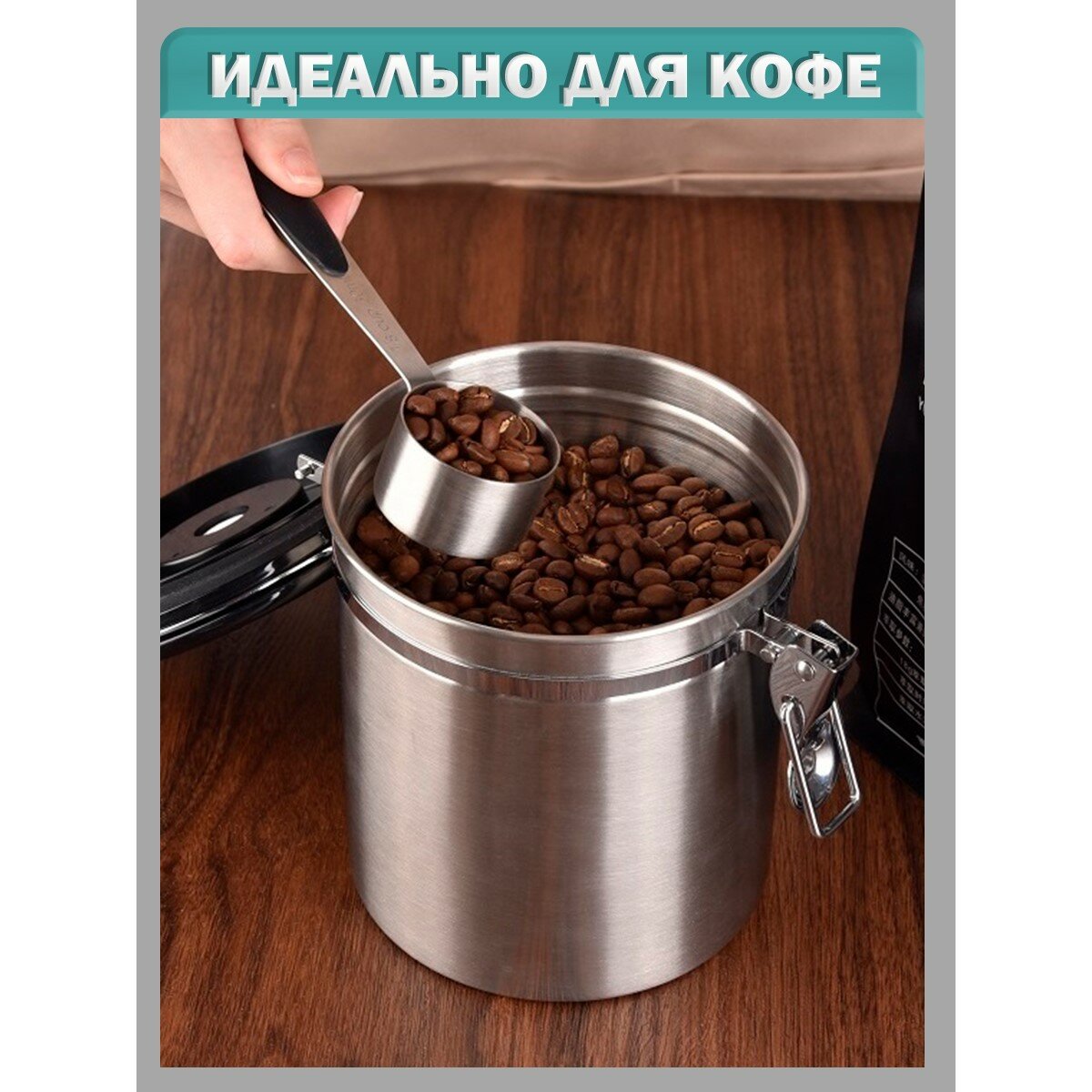 Контейнер с мерной ложкой для хранения кофе, чая и других сыпучих продуктов. Герметичный, с таймером, с обратным клапаном - нержавеющая сталь, 1800 мл