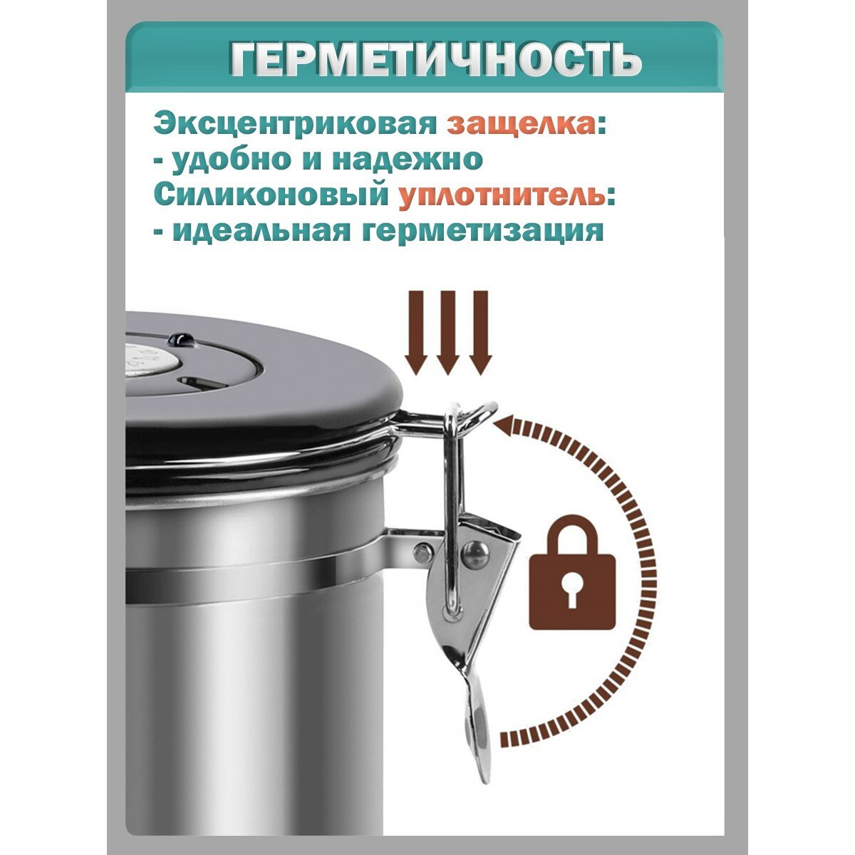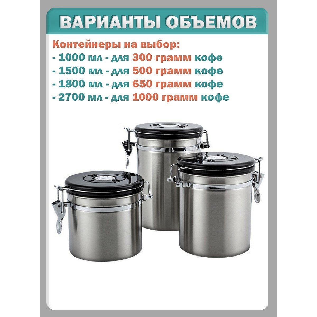 Контейнер с мерной ложкой для хранения кофе, чая и других сыпучих продуктов. Герметичный, с таймером, с обратным клапаном - нержавеющая сталь, 1000 мл