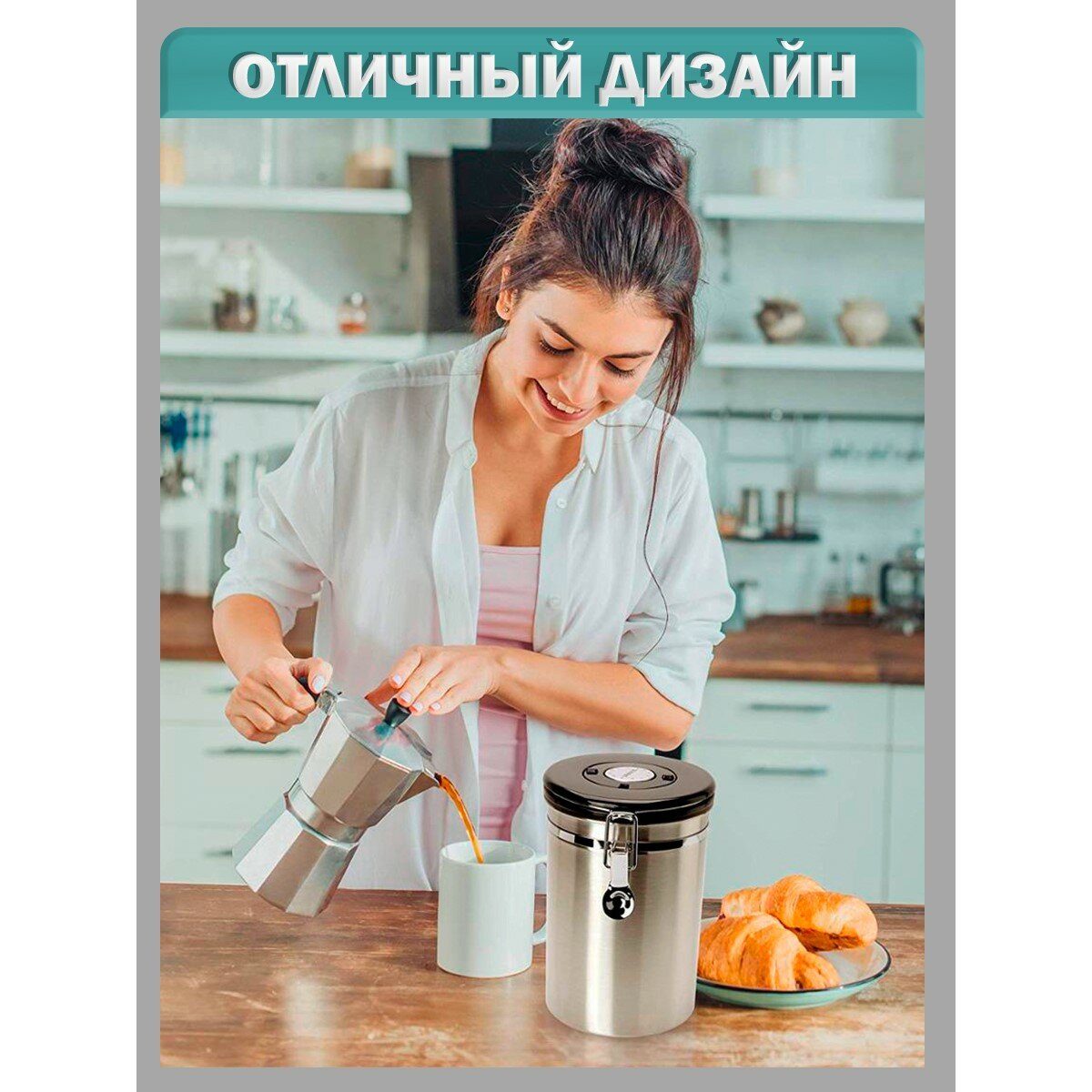 Контейнер для хранения сыпучих продуктов, зерен и молотого кофе, для чая, для сахара, для муки, для круп с ложкой. Банка для хранения герметичная, с таймером, металл - нержавеющая сталь, 1500 мл