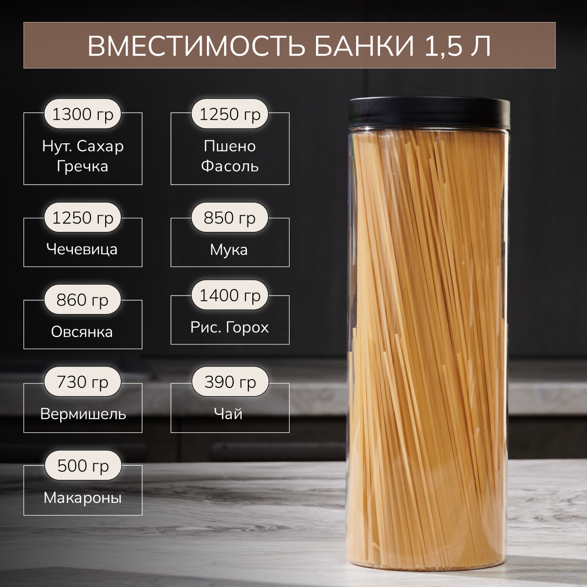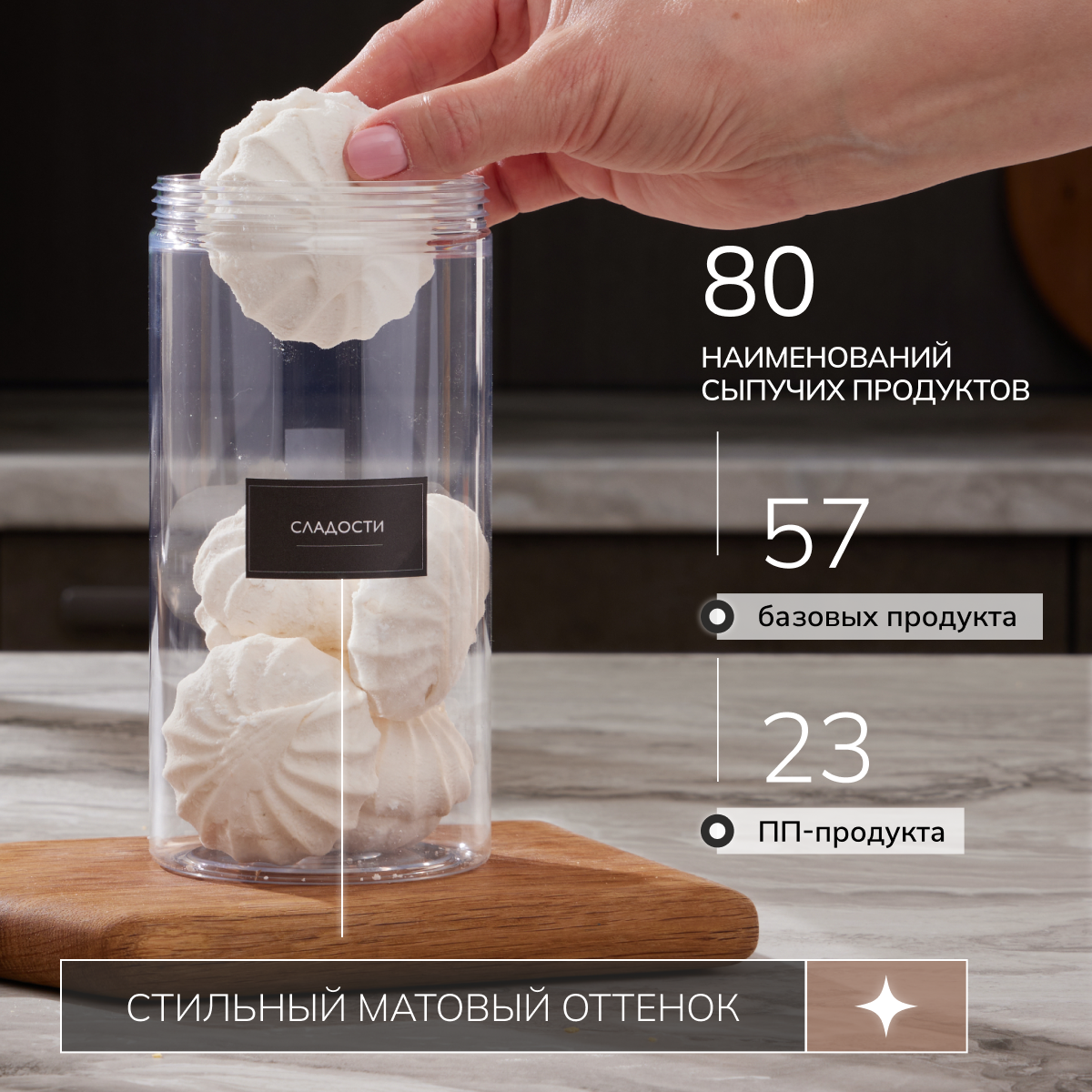 | Дополнительная информация | Набор баночек для порядка на кухне: 7 шт для специй и приправ, 10 шт для бакалеи, 1 шт для спагетти. Баночки позволят убрать визуальный шум , а также вы всегда будете знать какой продукт в каком количестве. |