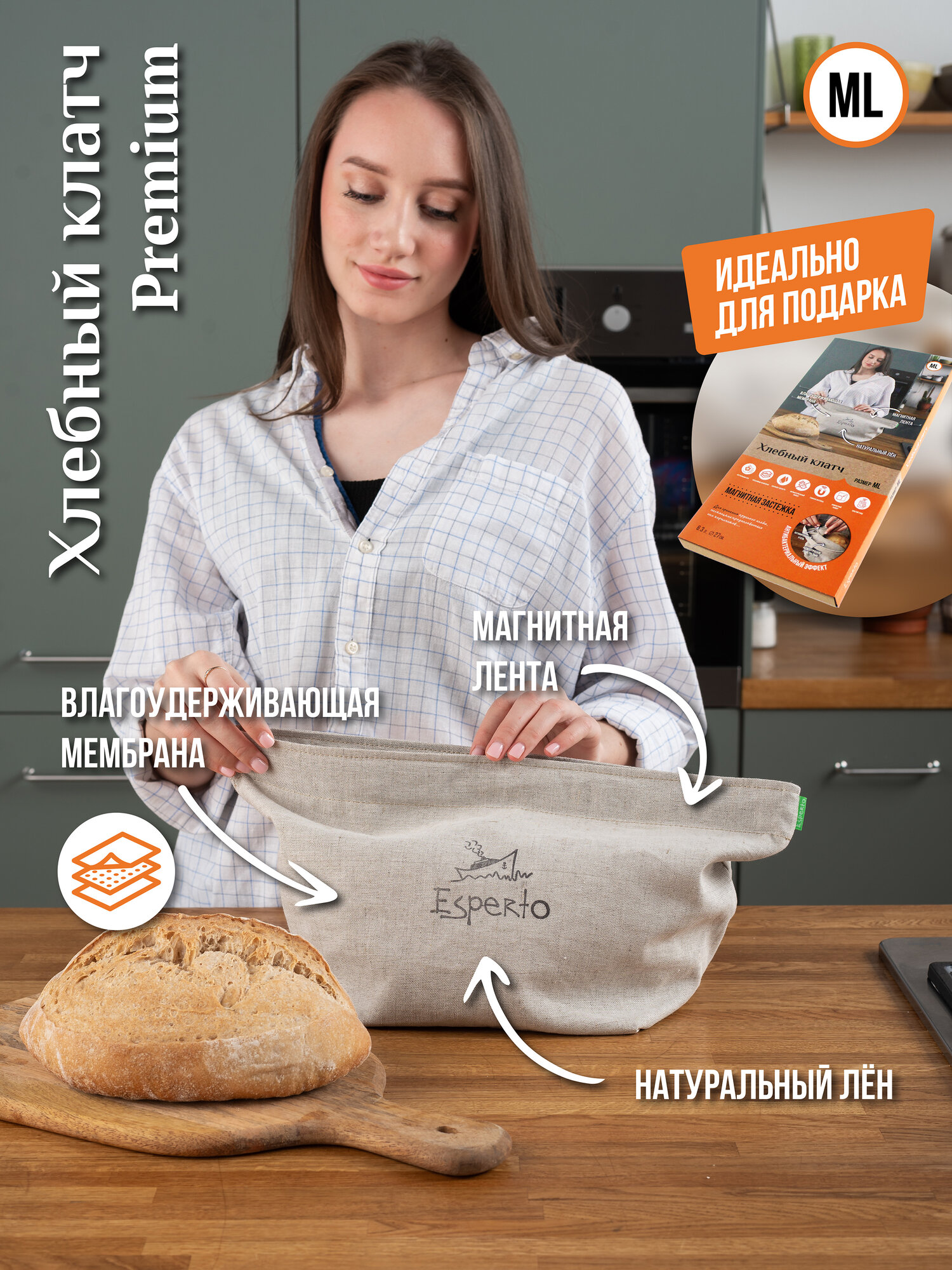 Льняной Хлебный клатч Esperto Premium ML, хлебница, белорусский лён, контейнер для еды, подарок, цвет бежевый, (6,3 л.)
