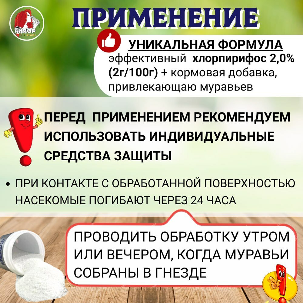 | Способ применения | в виде порошка: порошок рассыпать тонким слоем (ок. 10 г на 1 м²) на гнездо и на пути следования муравьев (т.е на муравьиных дорожках), на трещинах, щелях и швах, откуда он будет перенесен в гнездо, уничтожая колонию; в виде раствора: порошок развести в воде, тщательно помешивая, из расчета 100 г на 2,5 л воды, обработку проводить сразу после приготовления раствора; трещины, щели, швы и гнезда муравьев полить приготовленным раствором; также необходимо обработать все пути подхода к муравьиному гнезду; не обрабатывать места (пол, лестницы и т.п.) частого передвижения людей |
