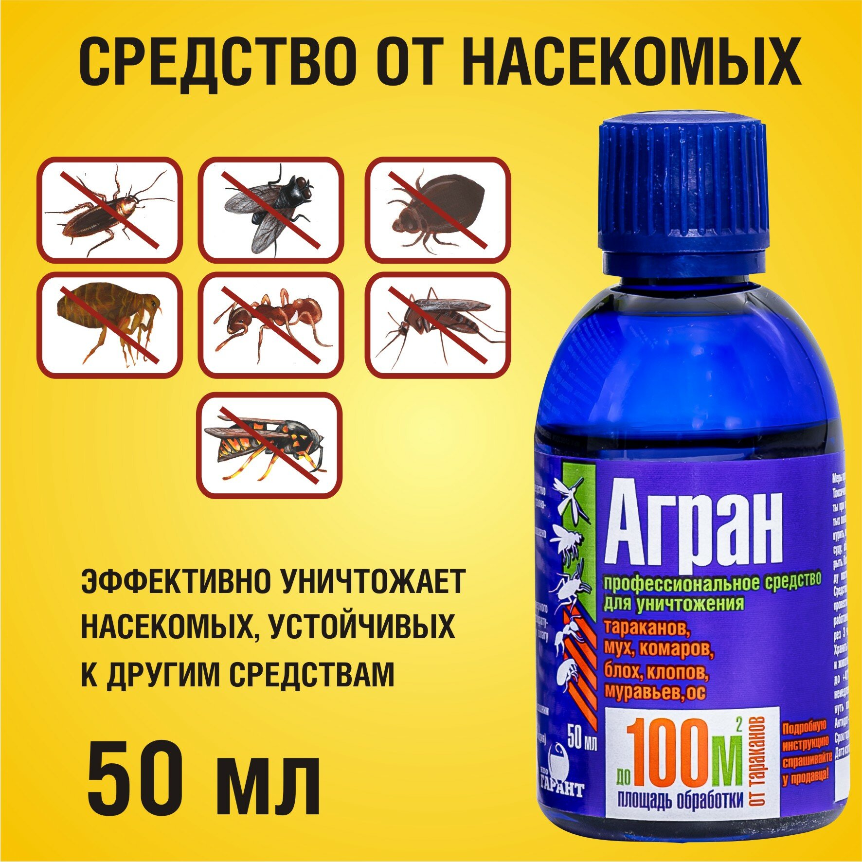 Агран средство от тараканов, муравьев, клопов, комаров, мух, ос, блох Гарант, флакон 50 мл