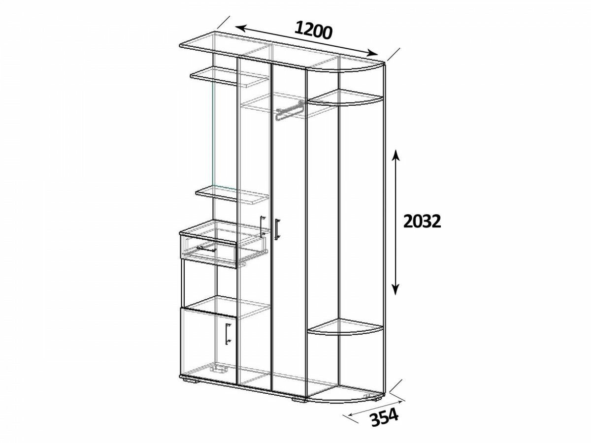 | Состав комплекта | шкаф с выдвижной штангой и с антресольной полкой; выдвижной ящик; вешалка с крючками для одежды; внизу ниша за распашной дверцей; зеркало |