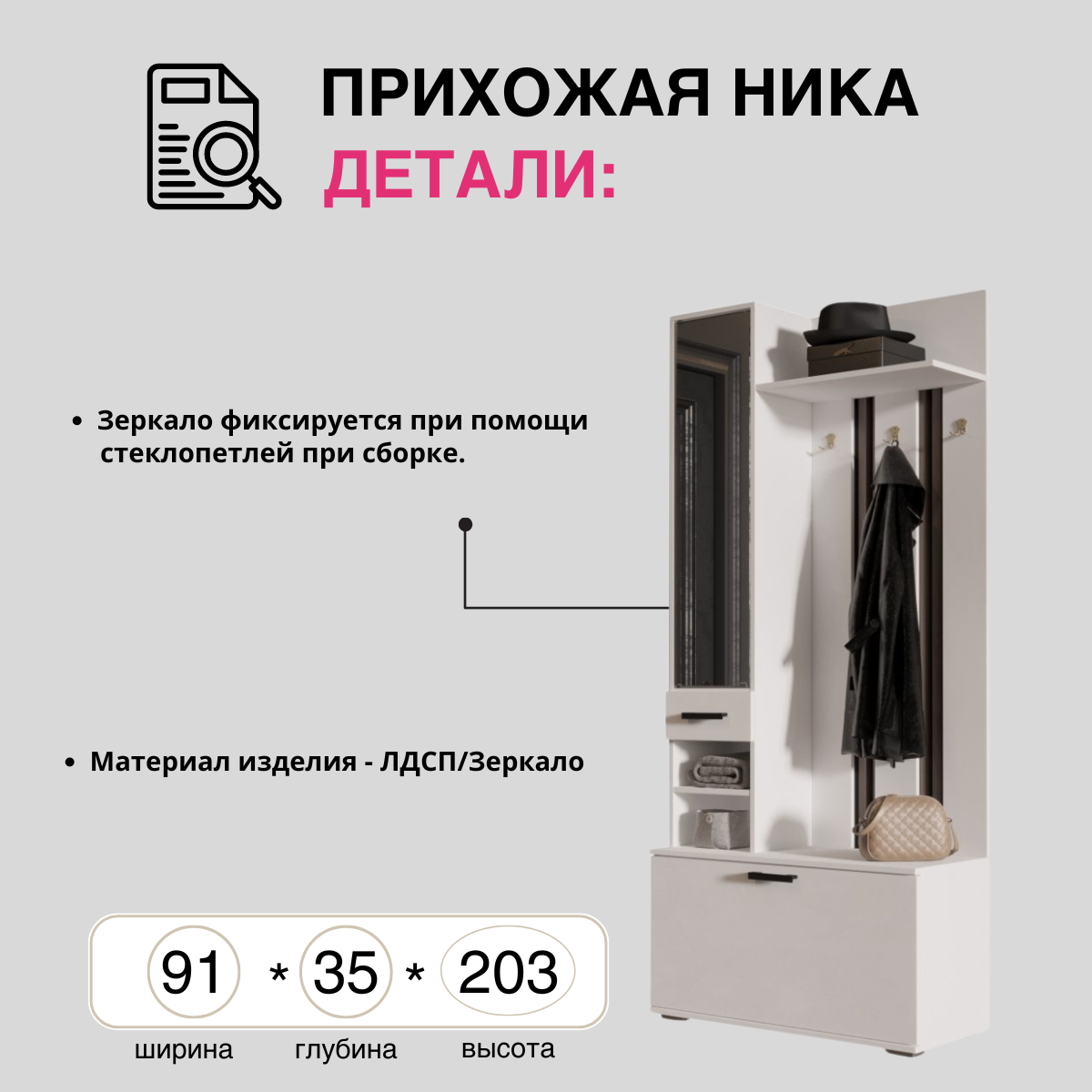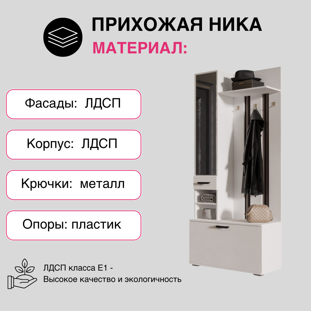 Ниже Вы можете прочитать отзывы на ЛДСП Прихожая НИКА ВЗ910 Вешалка с зеркалом Белый гладкий, ознакомится с подробными характеристиками, посмотреть интересные обзоры и фотографии на ЛДСП Прихожая НИКА ВЗ910 Вешалка с зеркалом Белый гладкий.