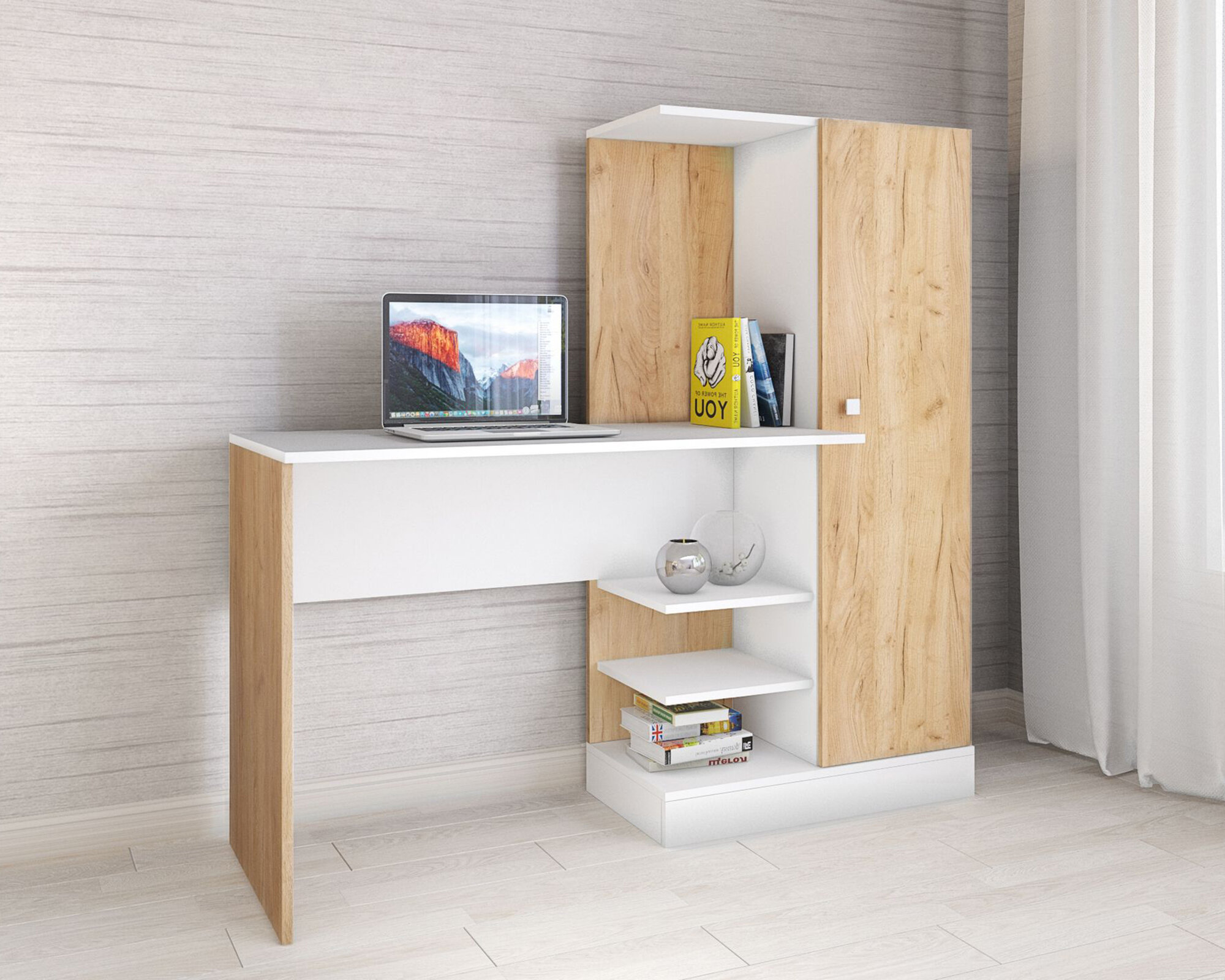 Компьютерный стол "Квартет-6", Белый с тиснением "Древесные поры", ЛДСП, с открытыми и закрытыми полками, для спальни, гостиной, детской, кабинета, 1350х1450х500, тэкс