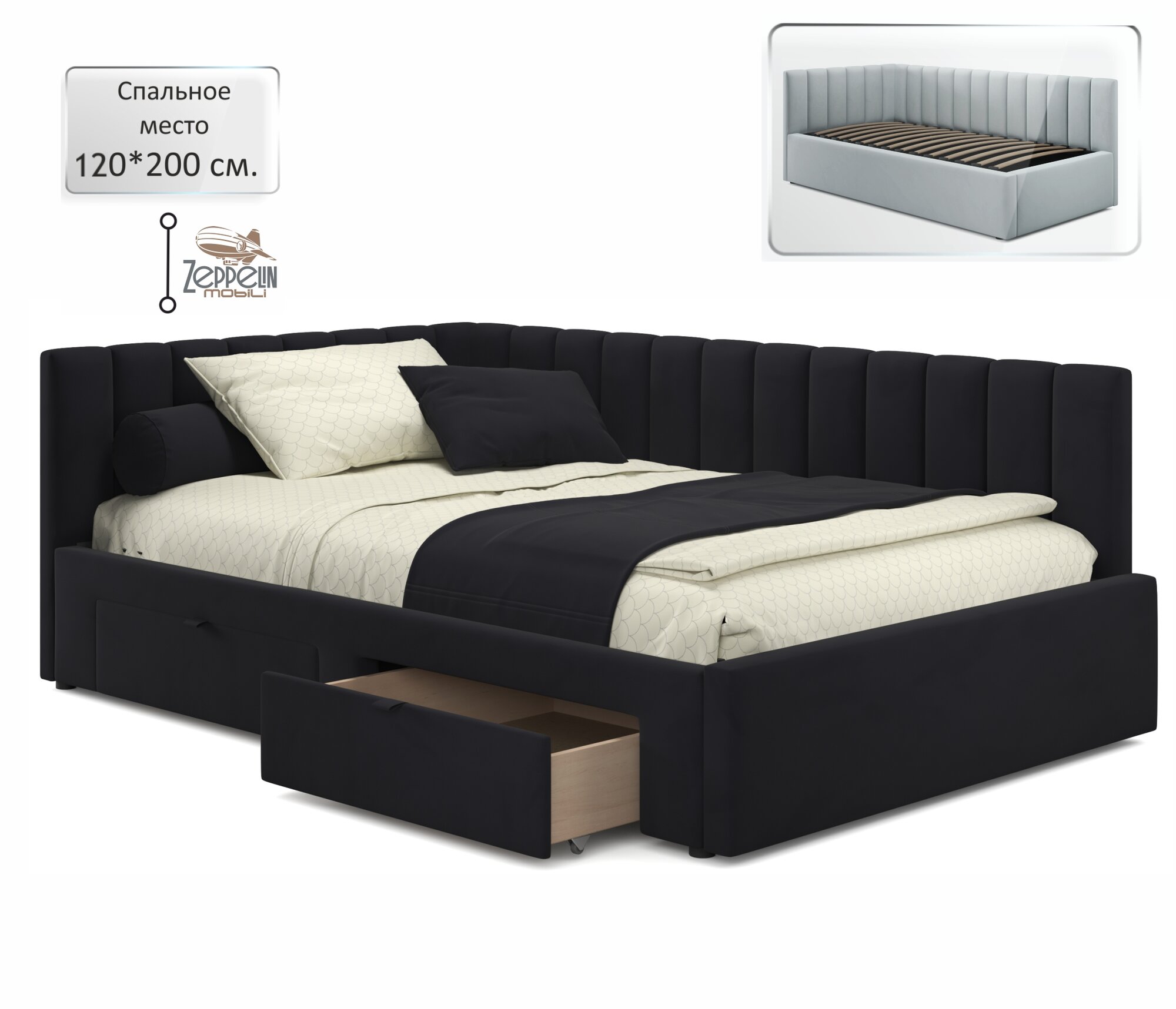 СохранитьКровать Milena Zeppelin 120х200 темная с ящиками, из велюра, с ортопедическими ламелями интересное: