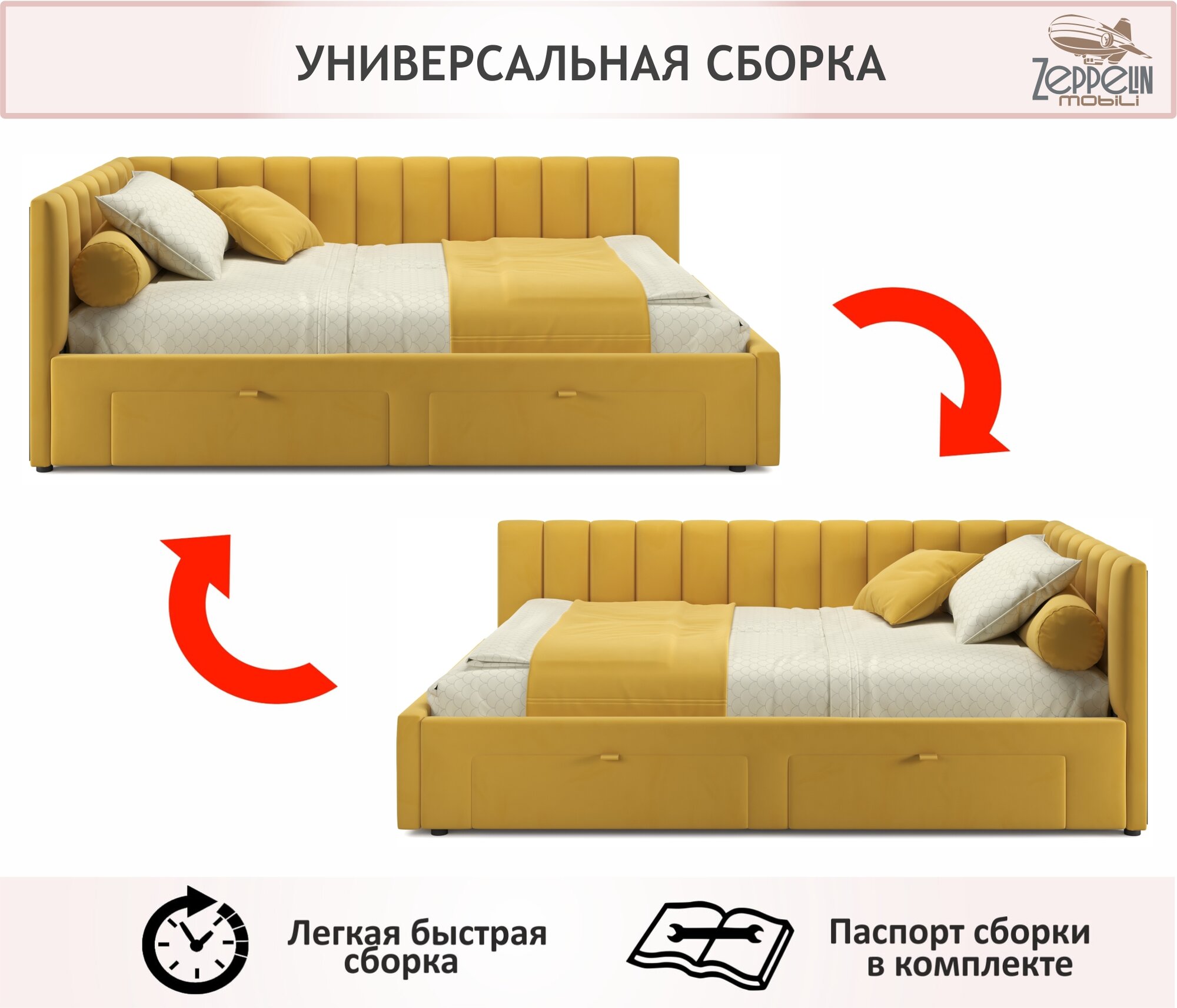 Кровать-тахта Milena 120х200 желтая с ящиками, 120х200, мягкая спинка из велюра, с ортопедическими ламелями, с ящиками для хранения