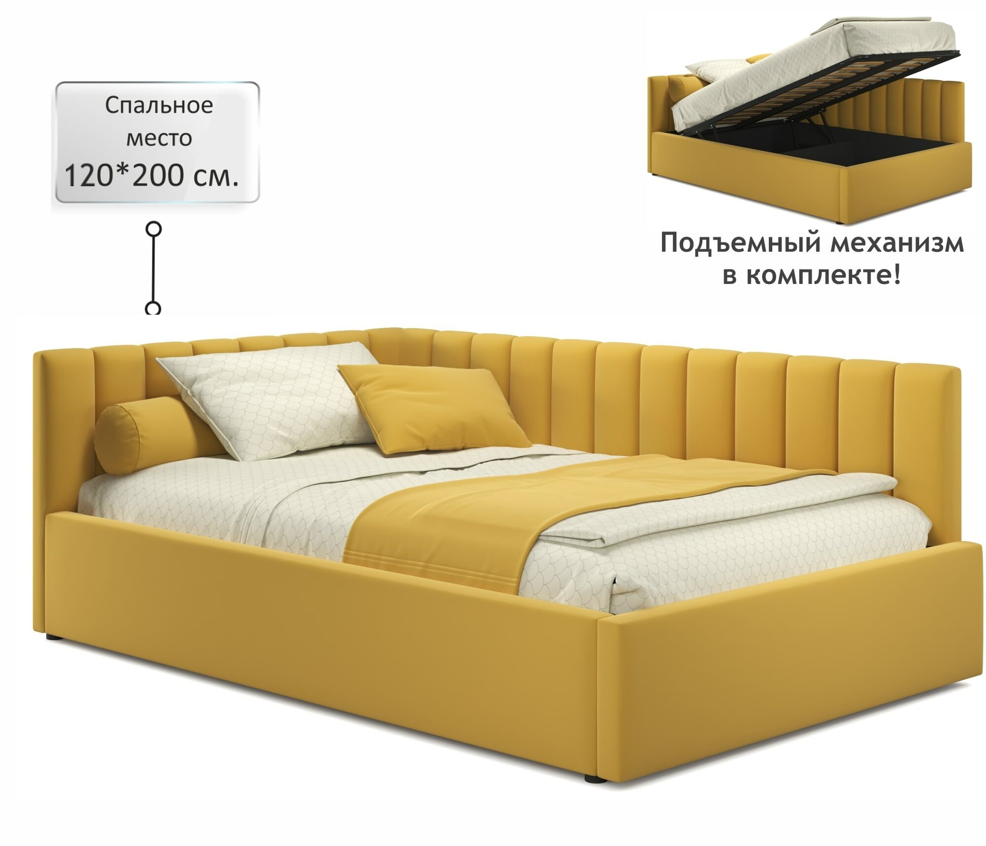 Кровать-тахта Milena 120х200 желтая подъемная, мягкая спинка из велюра, с ортопедическими ламелями, с ящиком для хранения