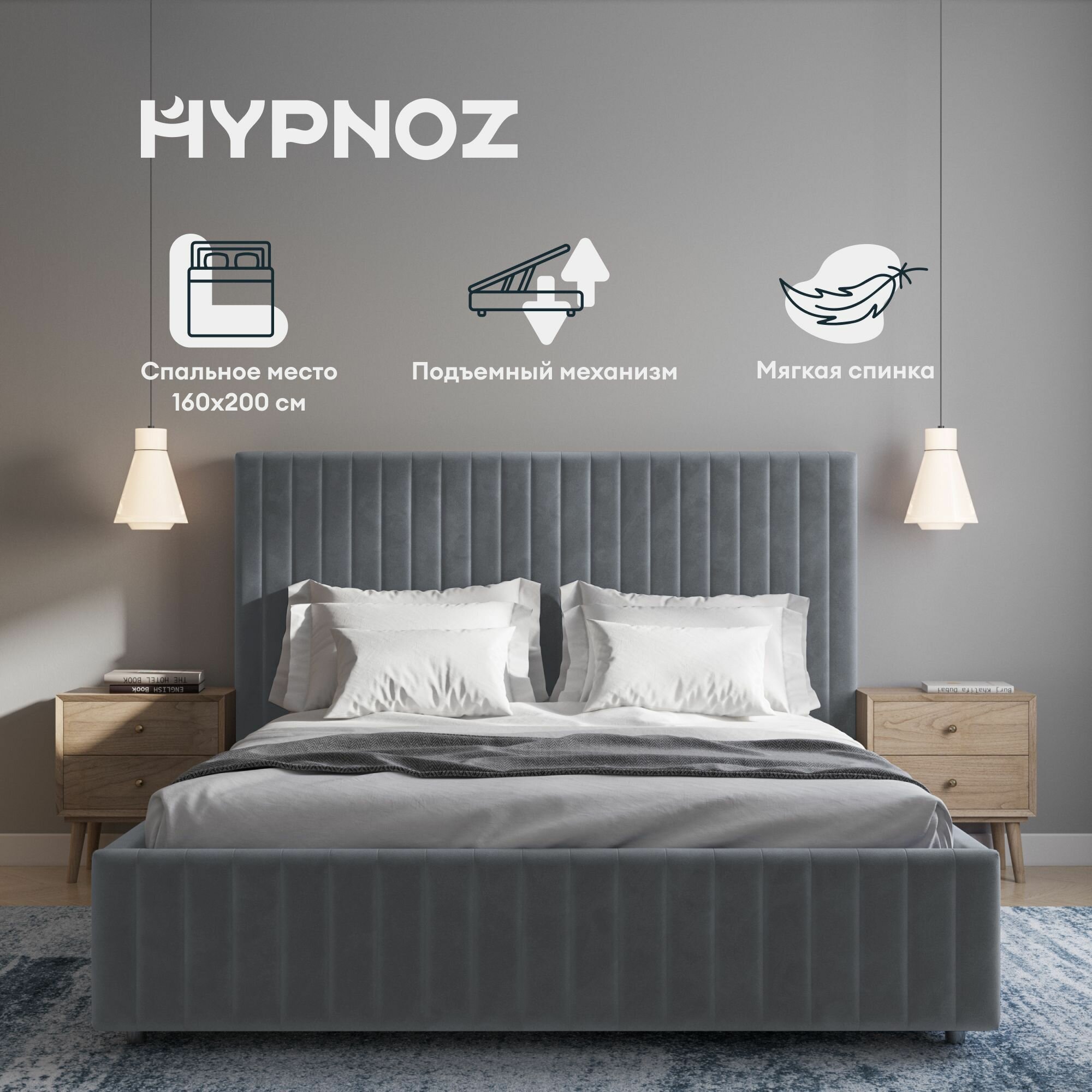 Кровать двуспальная HYPNOZ Salamanca 160х200, с подъёмным механизмом, Светло-серая