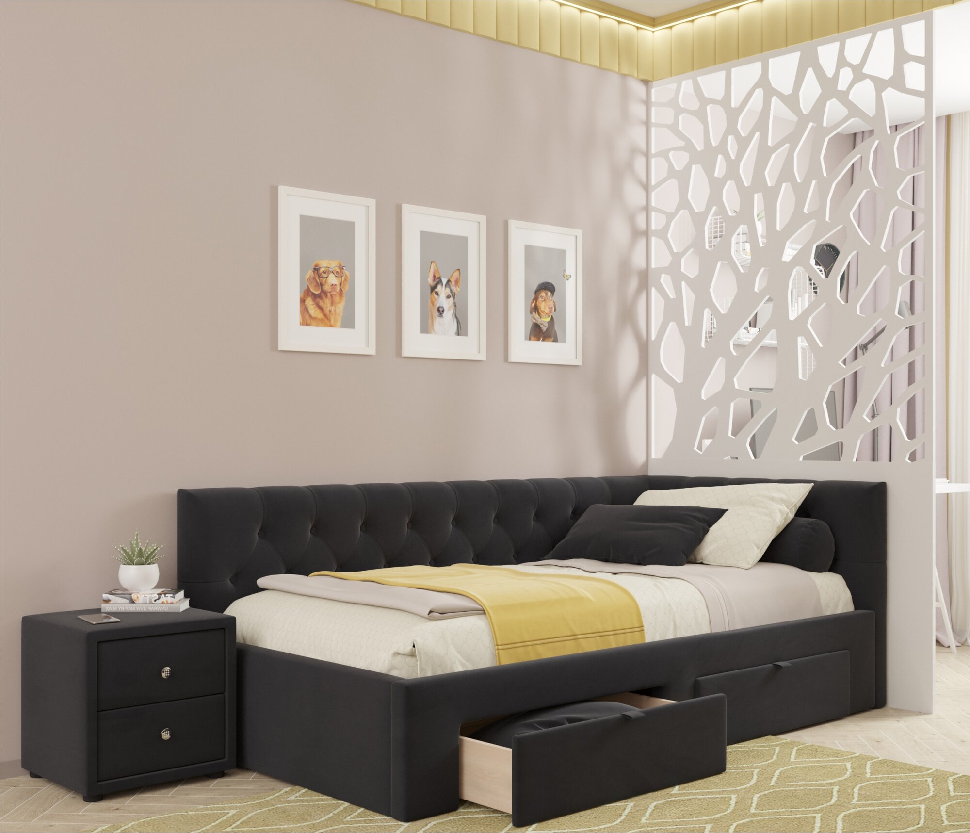 Односпальная кровать-тахта угловая Afelia 900 темная Zeppelin с ортопедическим основанием , 90х200, мягкая из велюра, с ящиками