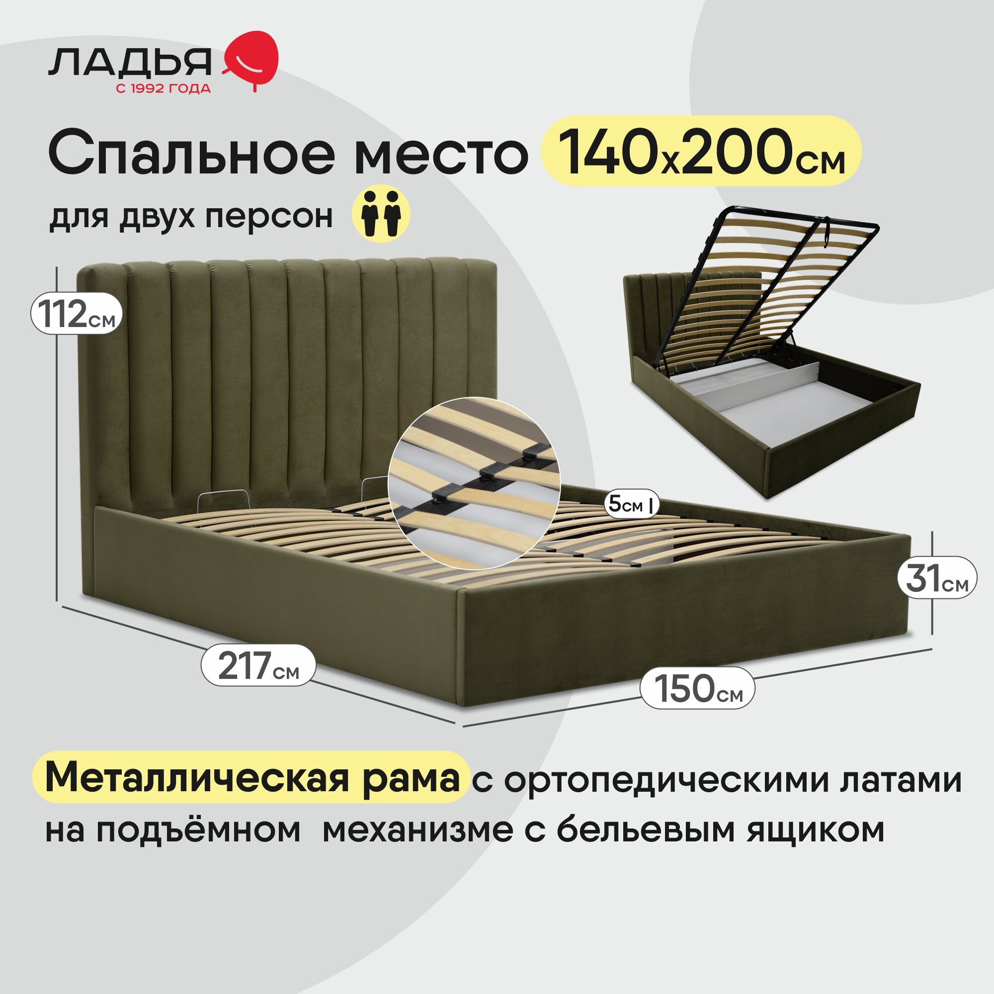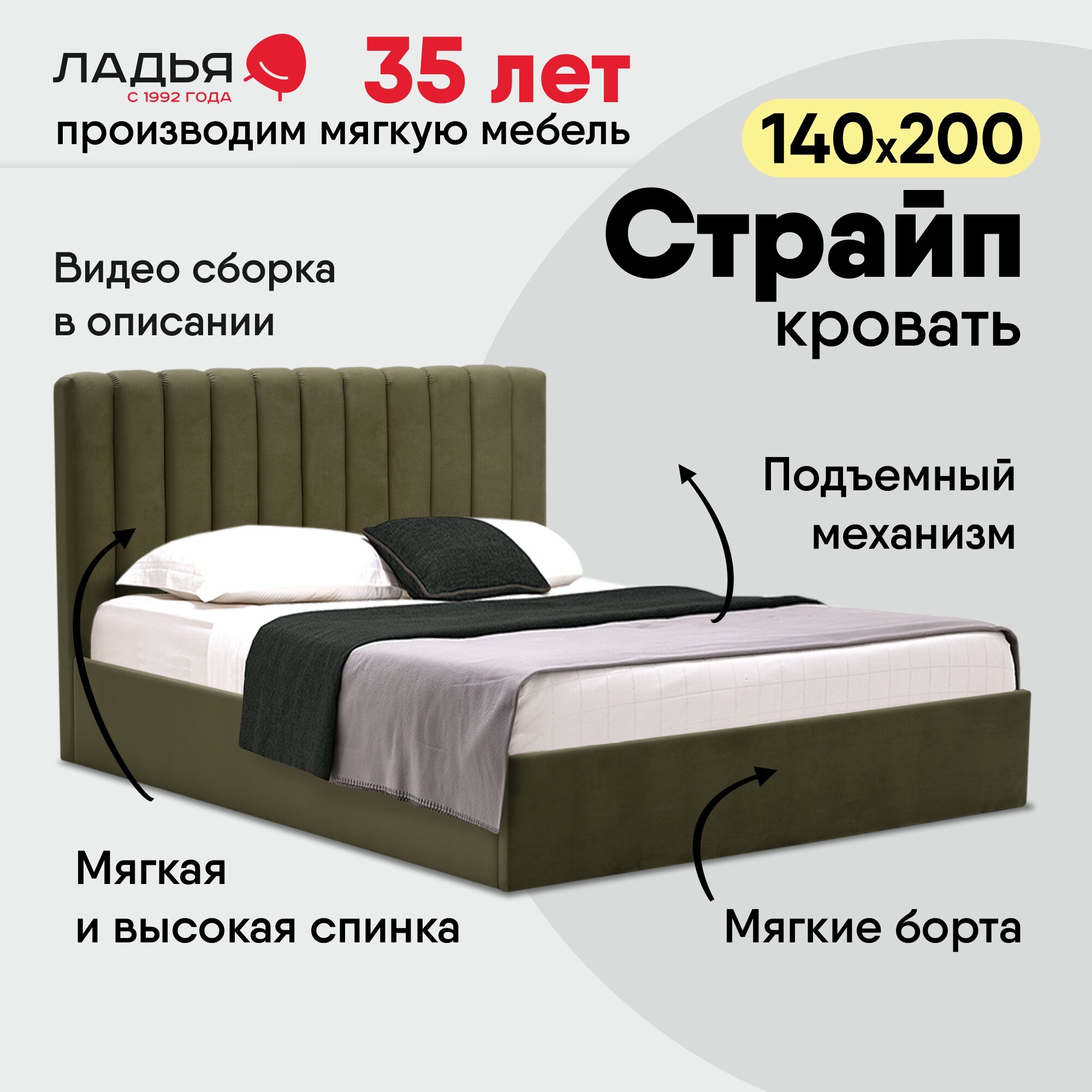 СохранитьДвуспальная кровать Страйп 140х200, с подъемным механизмом, Ладья, с мягким изголовьем для дома и спальни, ортопедическое основание, ящик для белья, Сonfetti Olive интересное: