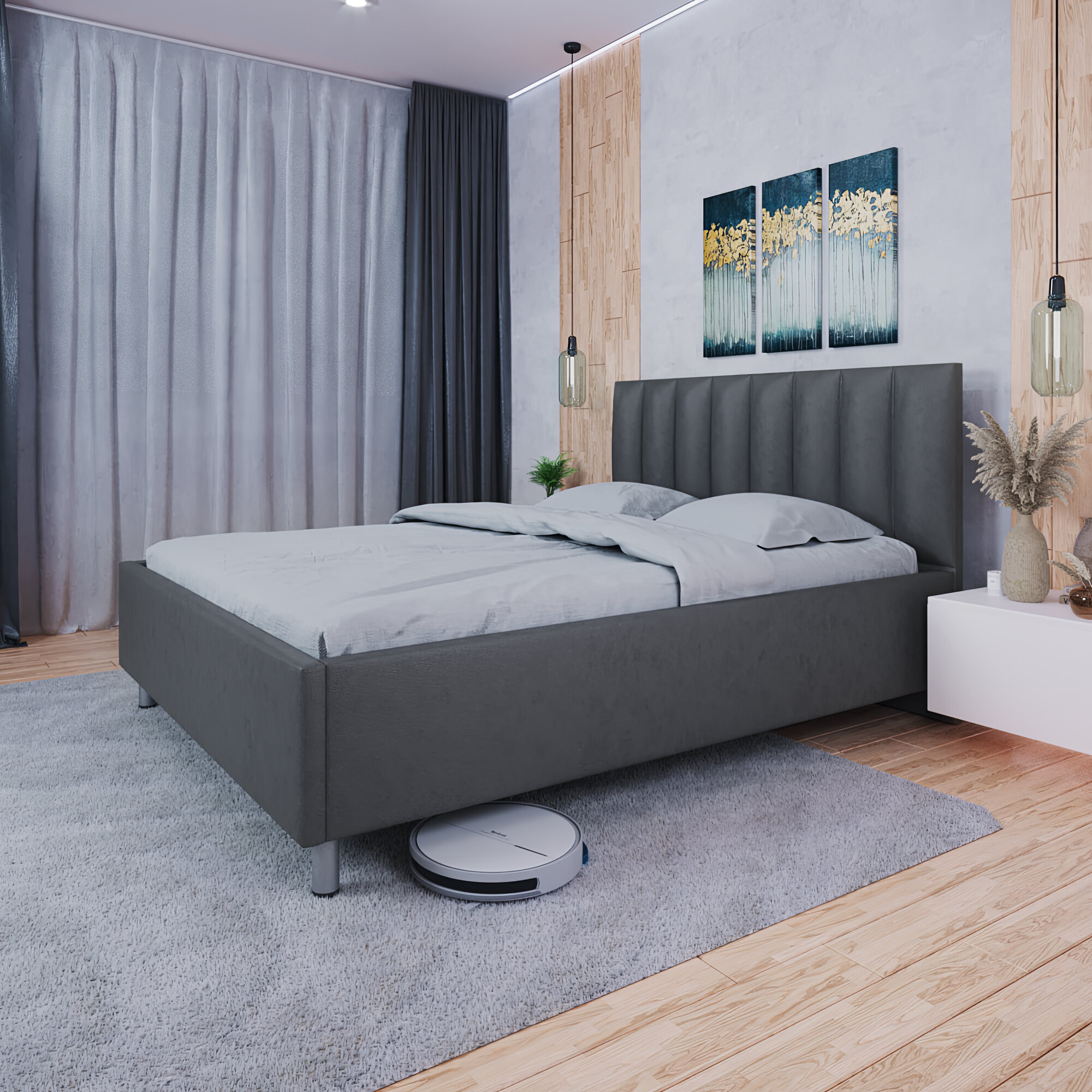 Мягкая двуспальная кровать 160x200 на ножках 12 см. с ортопедическим основанием, подъемным механизмом и бельевым ящиком