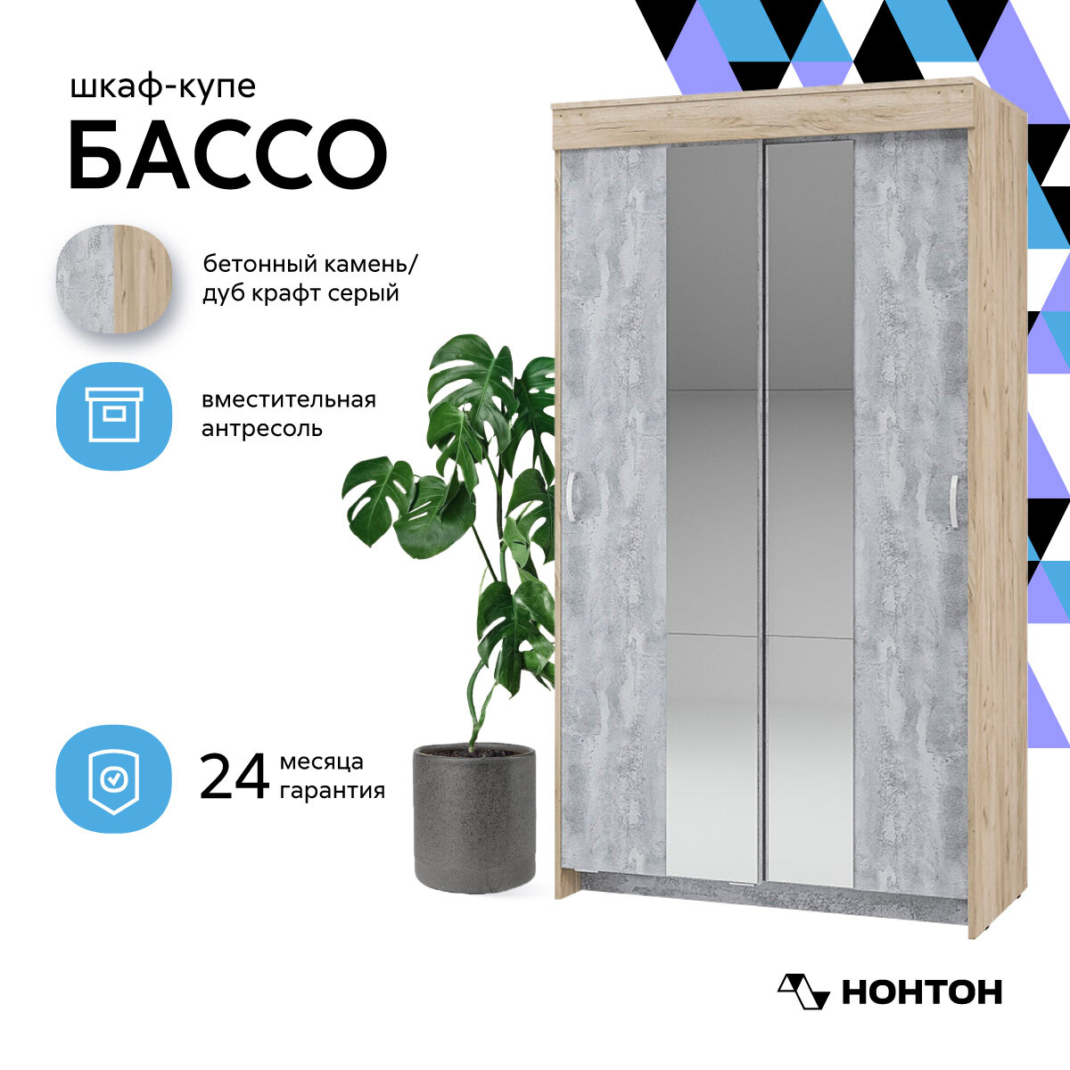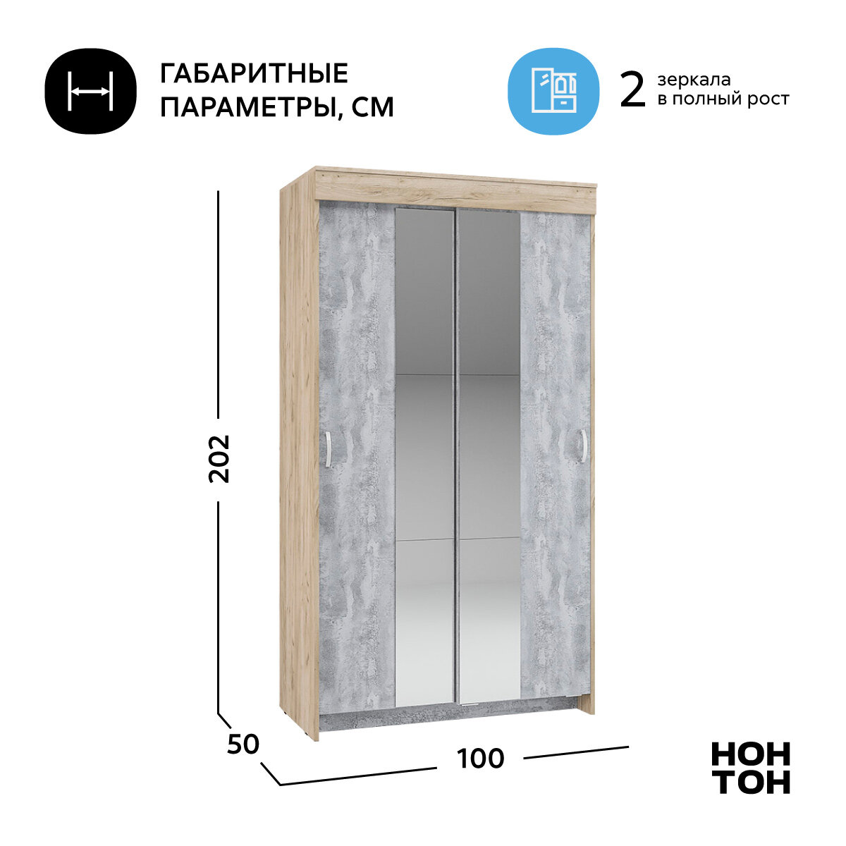 Шкаф-купе для одежды Нонтон Бассо, 2 зеркала, дуб крафт серый / бетонный камень 100 см