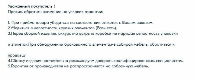 | Условия возврата | Если товар вам не подошел или не понравился, вы можете вернуть его в течение 7 календарных дней со дня получения. Подробнее про условия возврата написано здесь. |