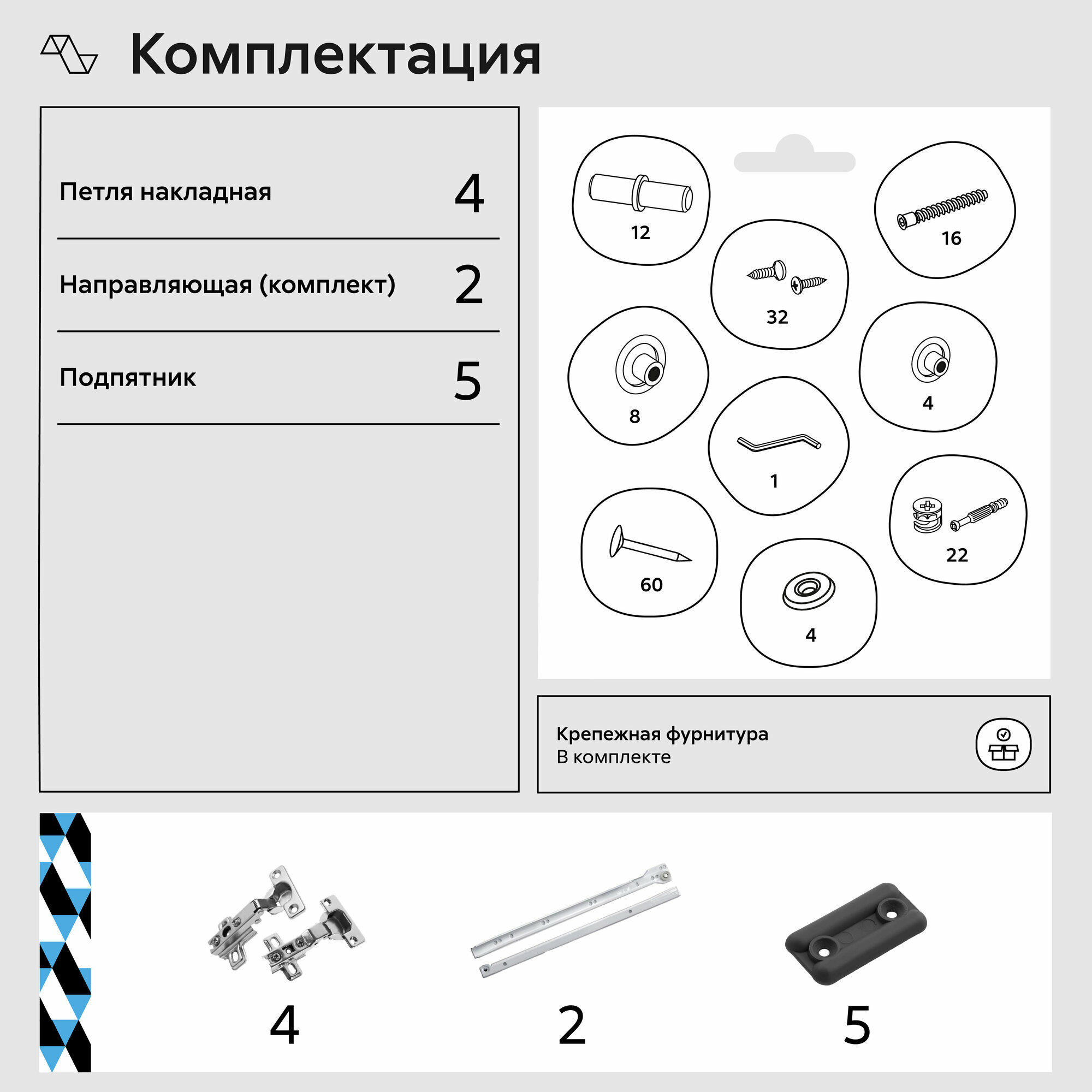 | Комплектация | Челси Шкаф 1200 (Ш) (Белый глянец холодный, белый) 120х211.6х51.4 см. Фурнитура, схема сборки |