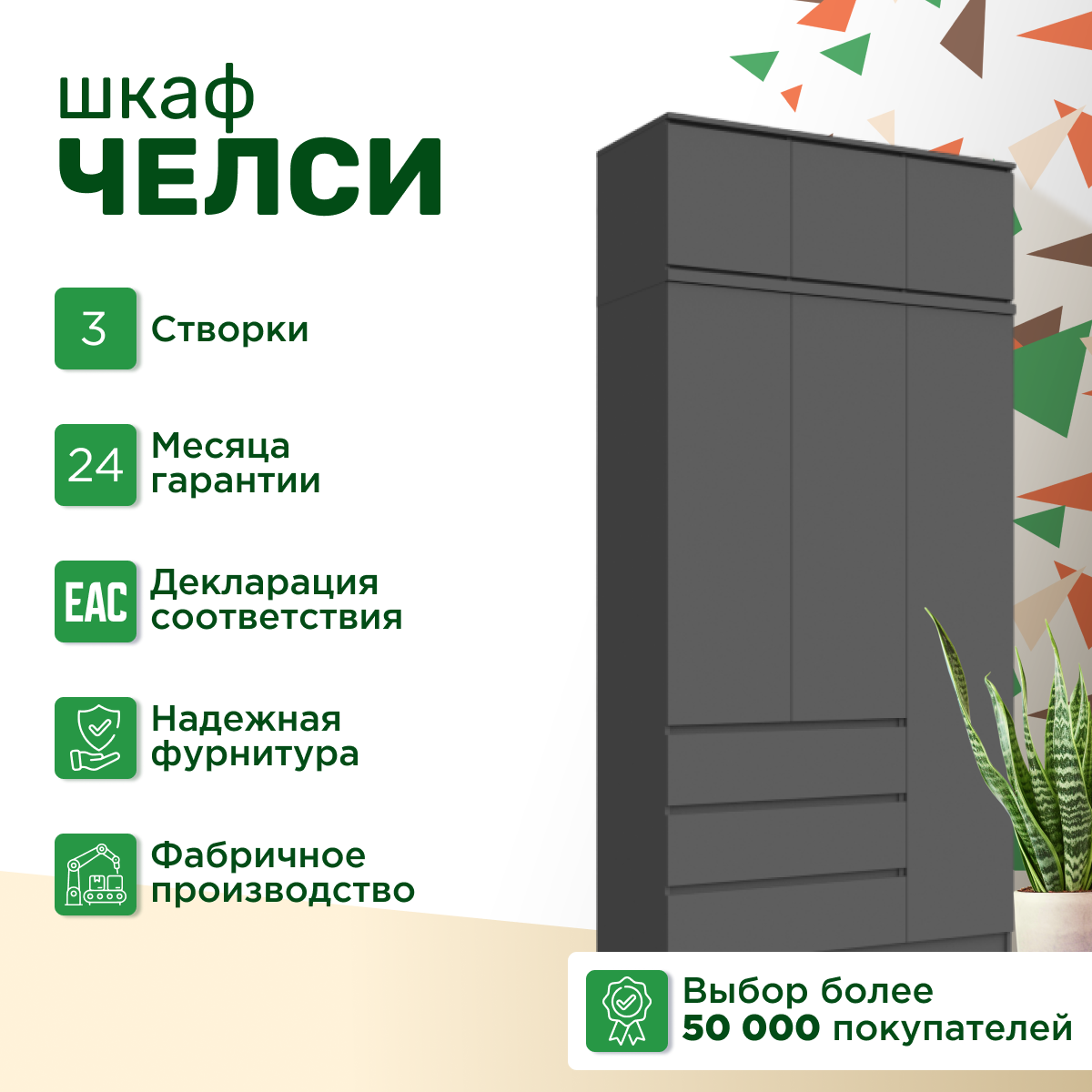 Трехстворчатый шкаф Челси 1200 Миф, цвет Графит/Шкаф распашной с 3-мя ящиками