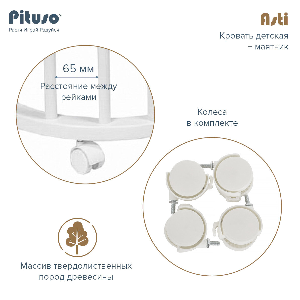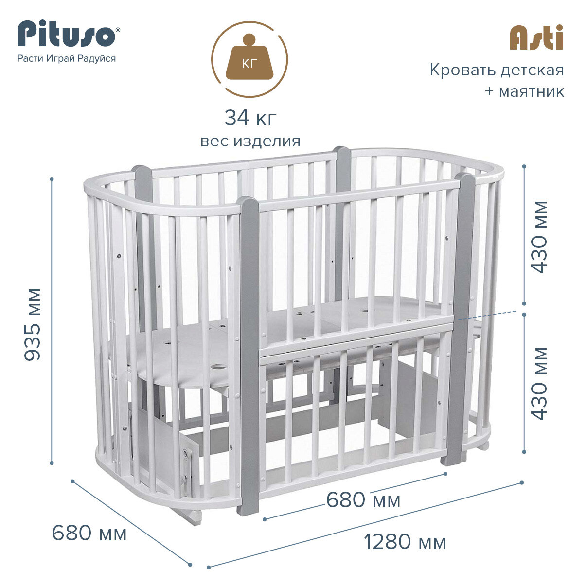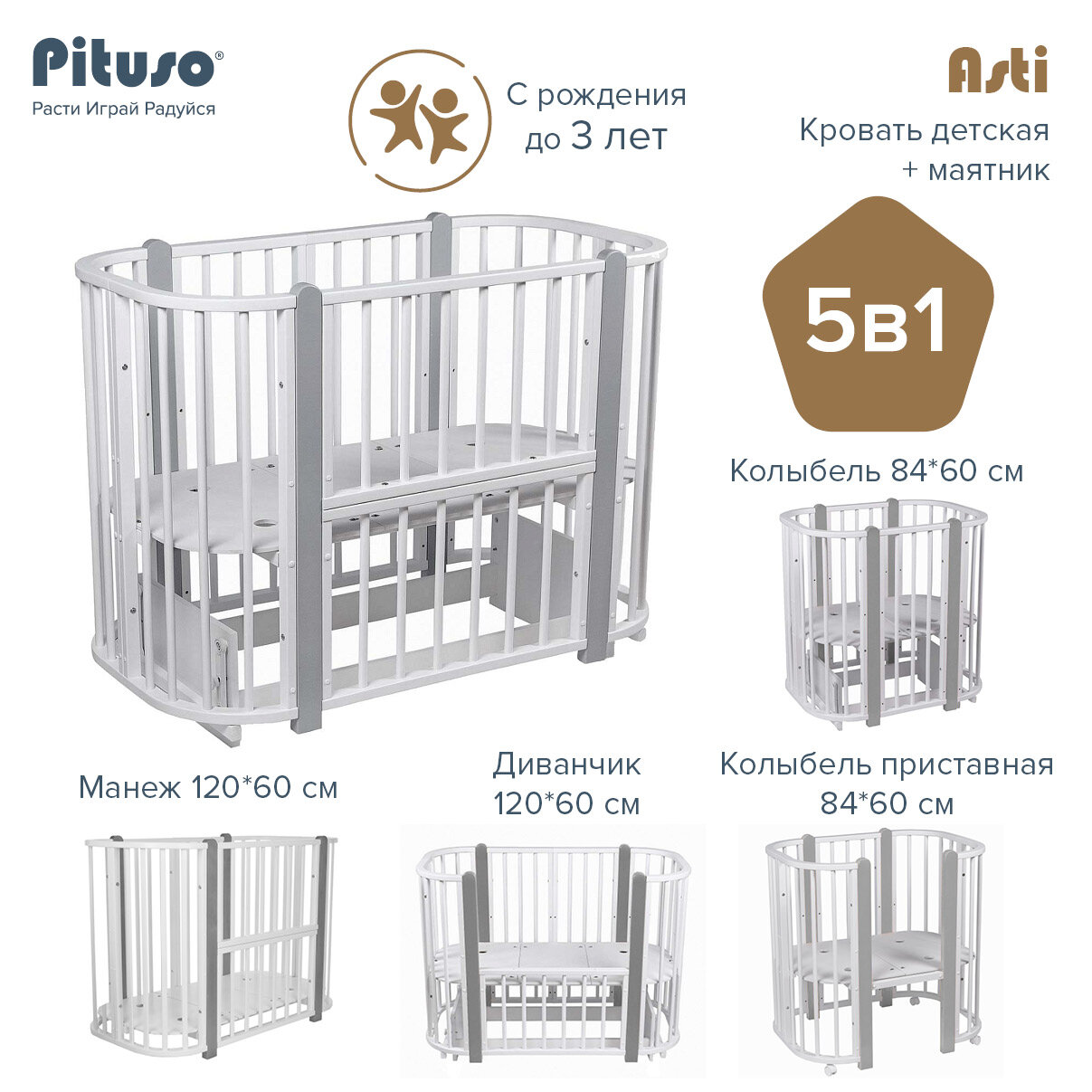 Кровать детская + маятник Pituso 5 в 1 Asti Белый-Серый интересное: