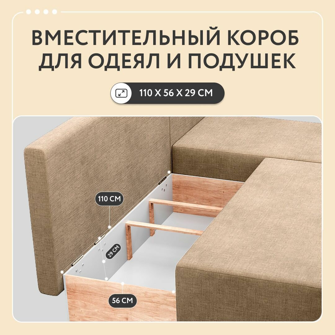 | Особенности | раскладная конструкция, съемные подушки, ящик для белья |