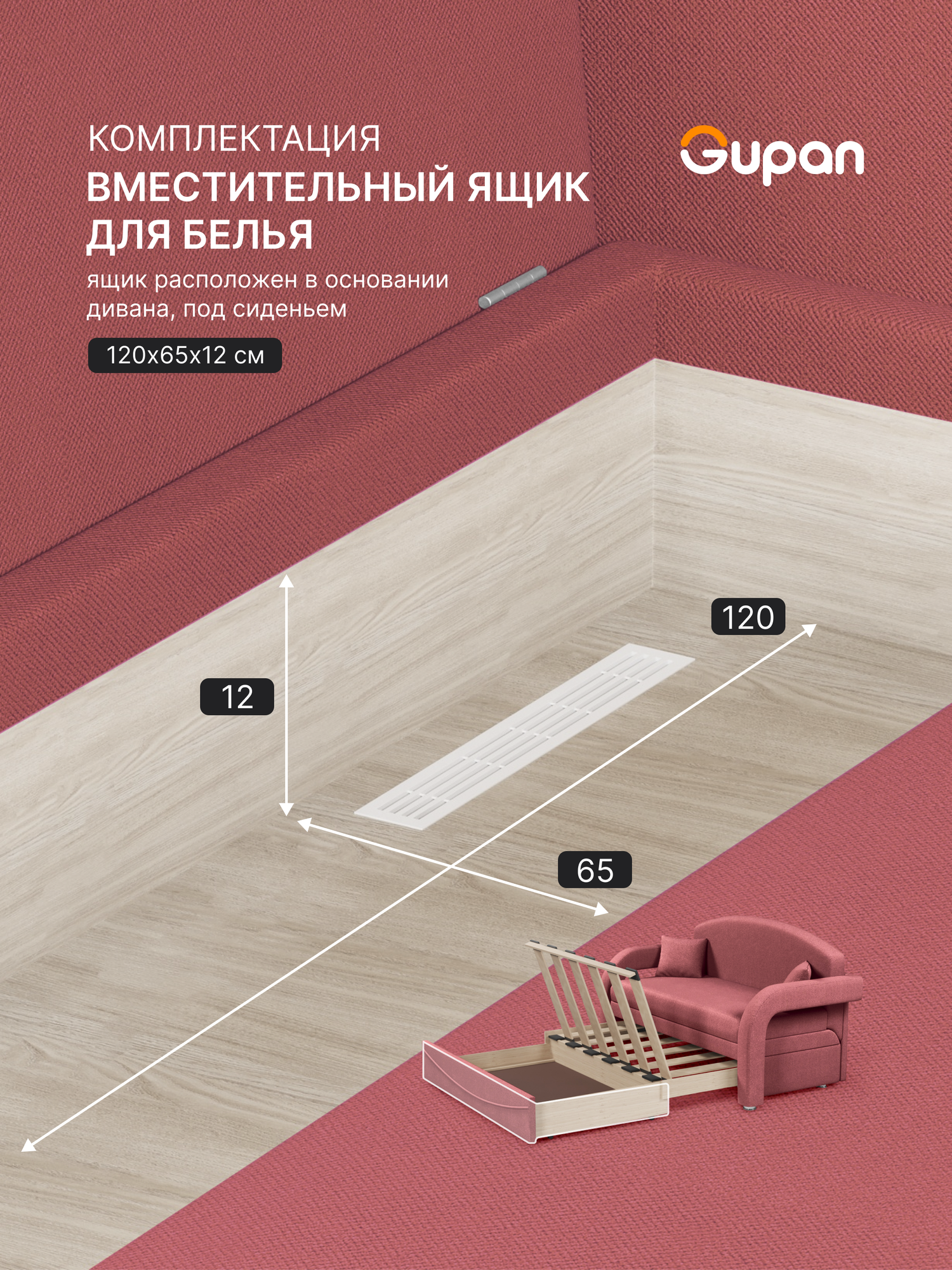 Диван кровать Gupan Атланта Классик Люкс Рогожка Savana Berry, раскладной, механизм еврокнижка, беспружинный, с ящиком для белья