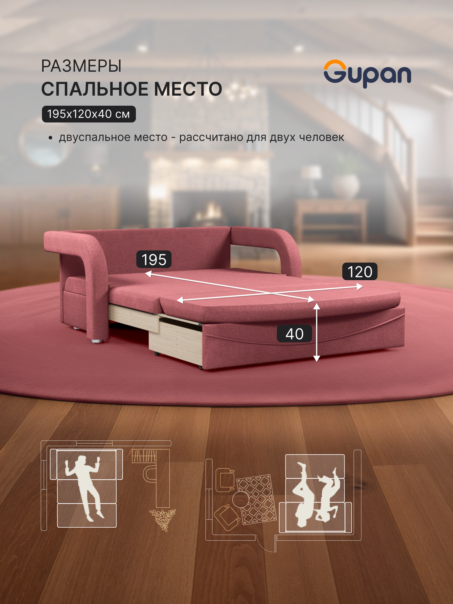 Диван кровать Gupan Алекс Рогожка Savana Berry, раскладной, механизм выкатной, беспружинный, с ящиком для белья