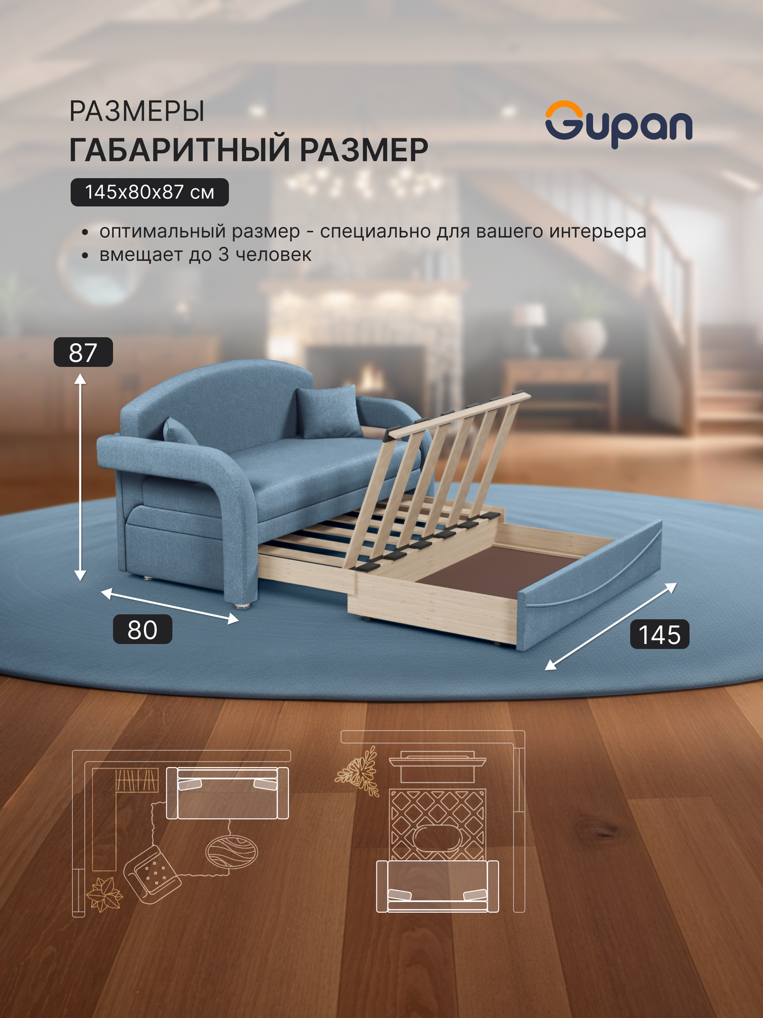 Диван кровать Gupan Атланта Классик Люкс, Рогожка Savana Blue, раскладной, механизм еврокнижка, беспружинный, с ящиком для белья
