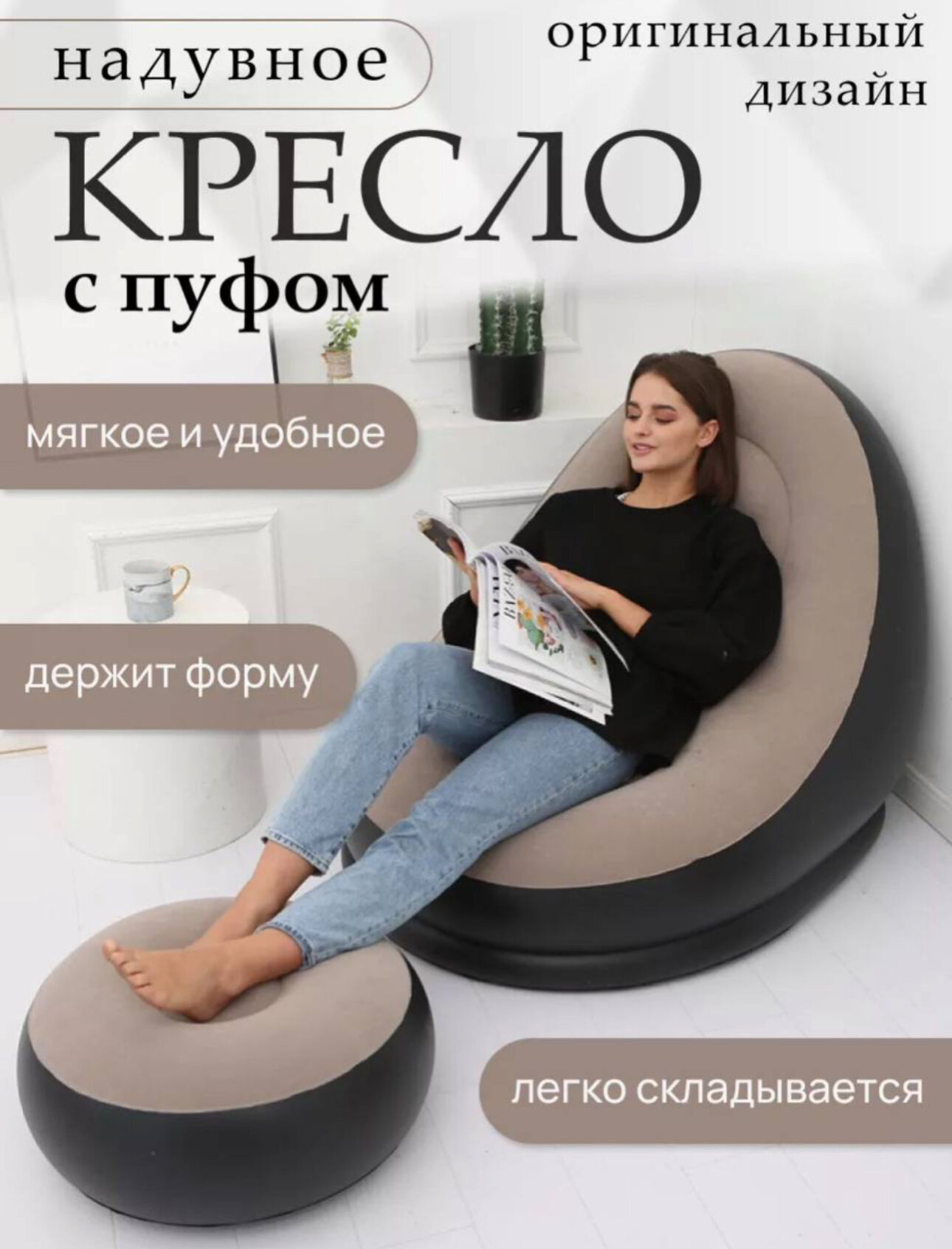 Кресло надувное kosmo.store, с пуфом, одноместное, бежевое интересное: