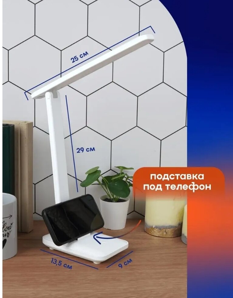 | Особенности | лампы в комплекте / регулировка наклона и поворота плафона / регулировка по высоте / регулировка яркости / режим ночника / с беспроводной зарядкой / складная конструкция |