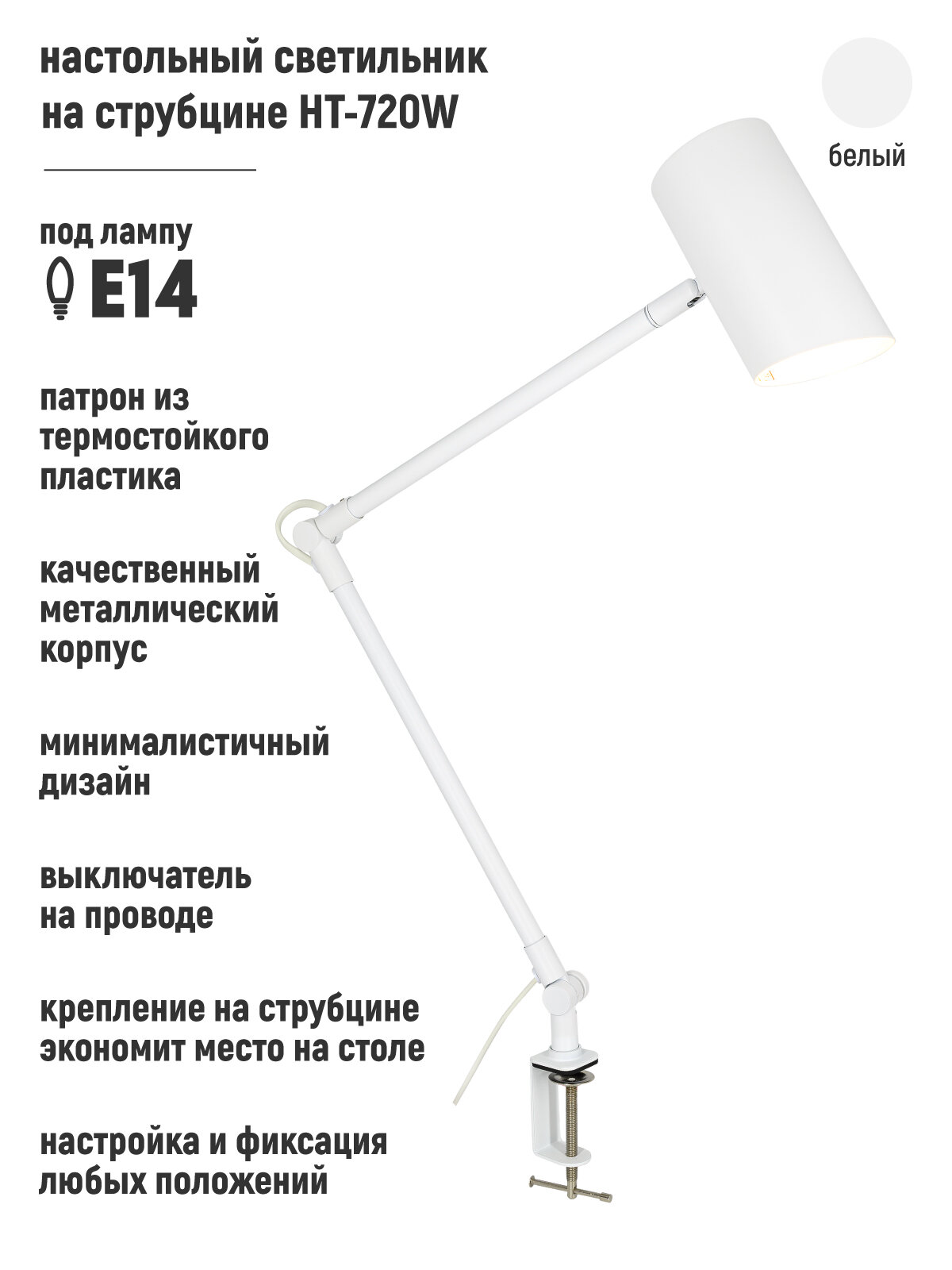 Светильник настольный на струбцине HT-720W, ARTSTYLE, белый, металлический, E14 интересное: