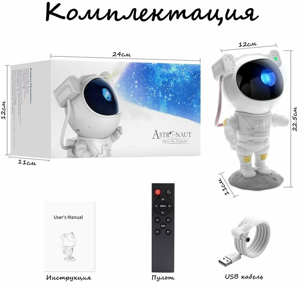 | Дополнительная информация | 8 режимов подсветки, таймер 45 мин и 90 мин, 7 видов проекции звездного неба, 3 режима работы, магнитный шлем вращается на 360 градусов, подвижные руки вращаются на 360 градусов, съемная подставка, |