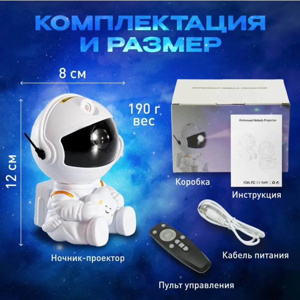 | Дополнительная информация | 8 режимов подсветки, таймер 45 мин и 90 мин, 7 видов проекции звездного неба, 3 режима работы, магнитный шлем вращается на 360 градусов, подвижные руки вращаются на 360 градусов, съемная подставка, |