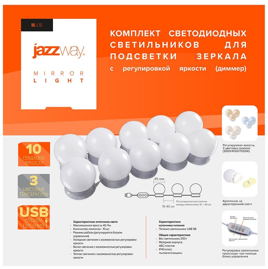 Подсветка для зеркала светодиодная JAZZway, комплект 10-ти самоклеющихся светильников ML-L10