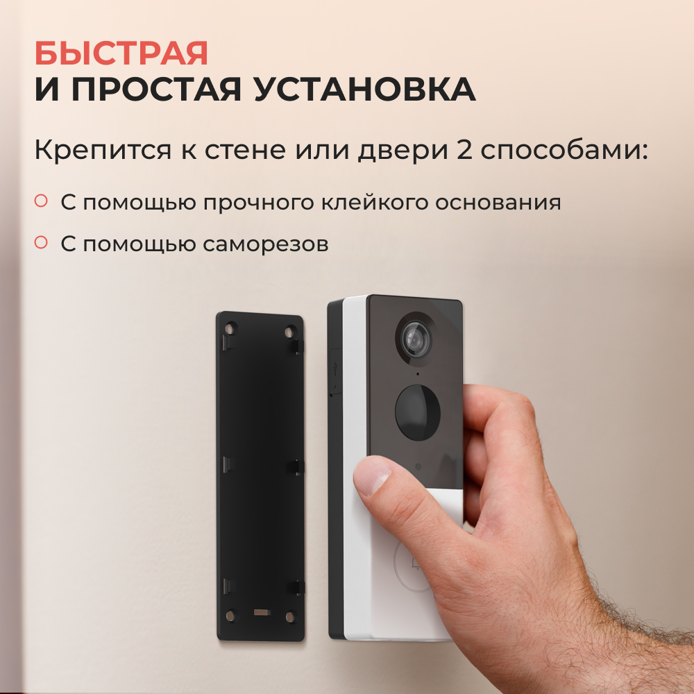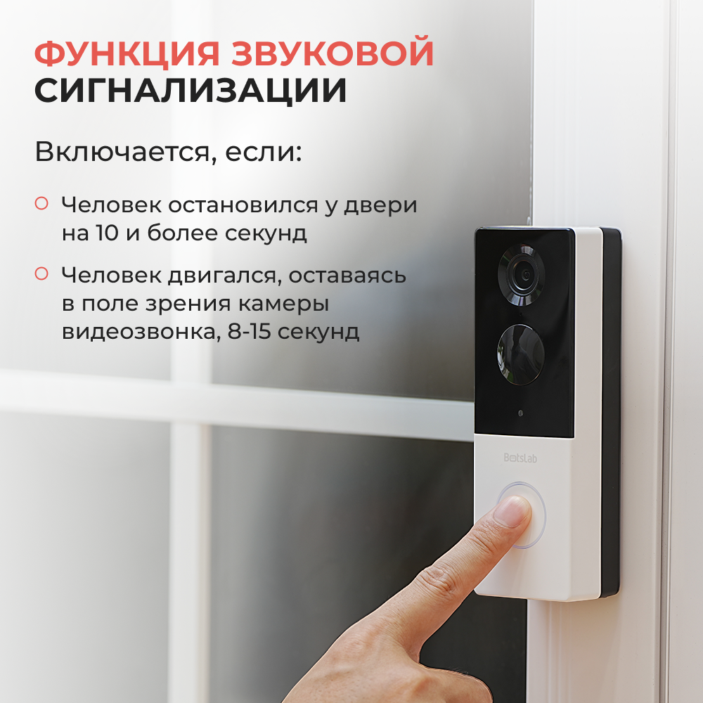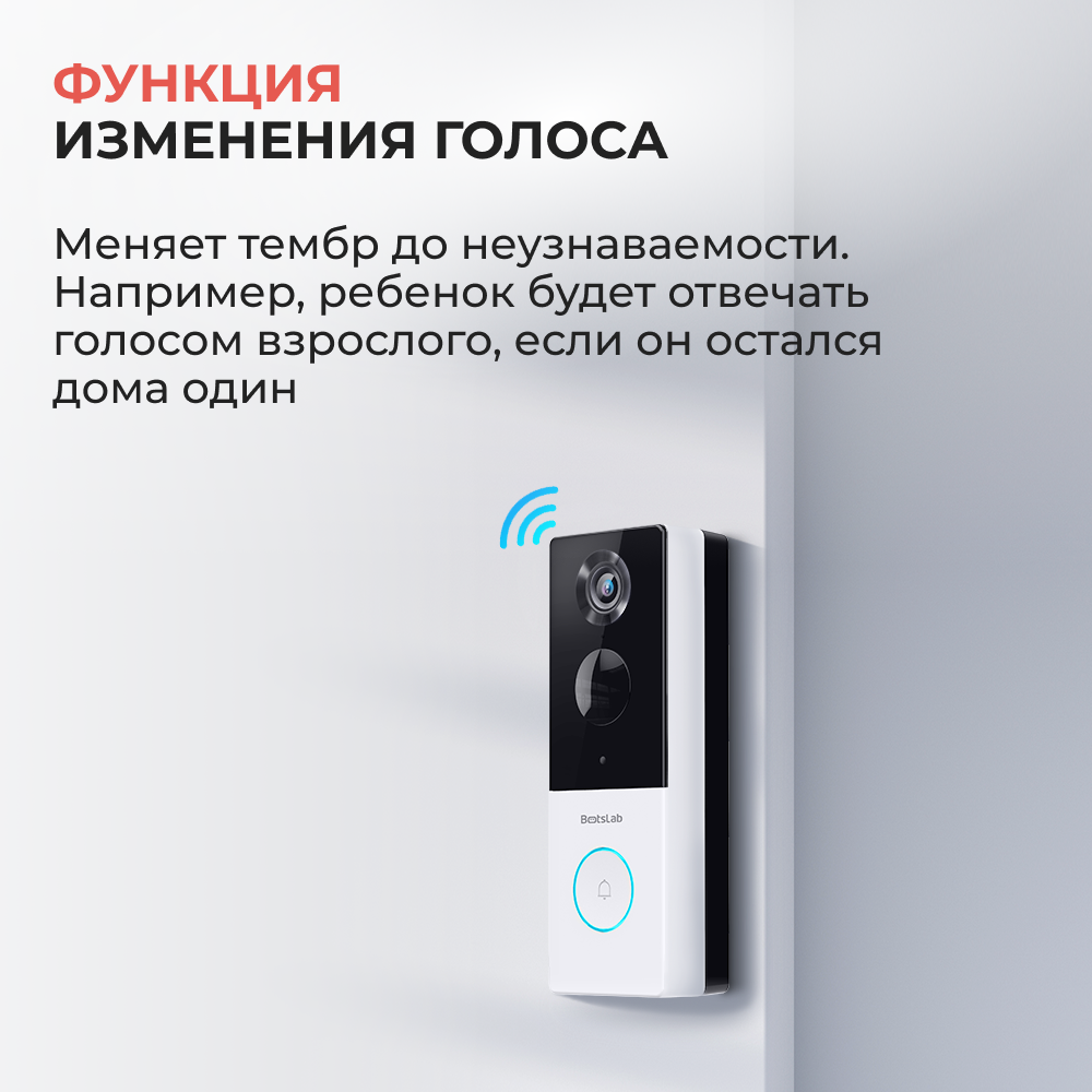 | Дополнительная информация | сигнализация с защитой от несанкционированного доступа: активируется и отправляет уведомление на телефон, если дверной звонок снимают. Функция звуковой сигнализации - будет включаться если: 1) человек остановился у двери на 10 и более секунд; 2) человек двигался, оставаясь в поле зрения камеры видеозвонка 8-15 секунд. Быстрая, простая и надежная установка: видеозвонок крепится к стене или двери двумя способами: 1) с помощью прочного клейкого основания; 2) с помощью саморезов. Снять замок с двери будет крайне сложно. Удаленные оповещения: мгновенные уведомления в приложении при обнаружении движения или людей. Можно отвечать на звонок в дверь с помощью смартфона, находясь вне дома. Функция изменения голоса позволяет изменить тембр до неузнаваемости. Например, ребенок может отвечать голосом взрослого, если он дома один |