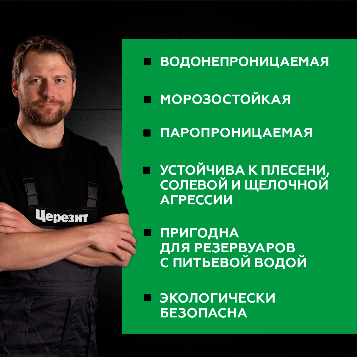 | Дополнительная информация | Может применяться: для наружной и внутренней гидроизоляции заглубленных и подземных сооружений (в т.ч. в сочетании с санирующими штукатурками Ceresit); для гидроизоляции небольших монолитных ванн крытых бассейнов и резервуаров для воды хозяйственно-питьевого назначения; для гидроизоляции влажных помещений (ванных, душевых, туалетов, кухонь, промышленных помещений и т.д.) в т.ч в системе «теплый пол» под плиточную облицовку; для защиты градирен, гидротехнических и очистных сооружений, тоннелей и других бетонных конструкций от увлажнения и морозного разрушения; для заполнения шпуров и пустот при инъектировании кладок старых зданий (см. CO 81). Гидроизоляцию следует защитить от механических повреждений плиточной облицовкой или не содержащими гипс штукатуркой или стяжкой. |