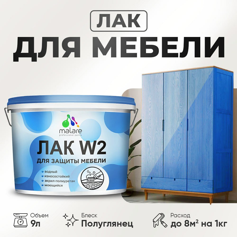 Лак водный Malare для мебели, кухонных фасадов, деревянных и минеральных поверхностей, высокопрочный, без запаха, прозрачный, 9 кг.
