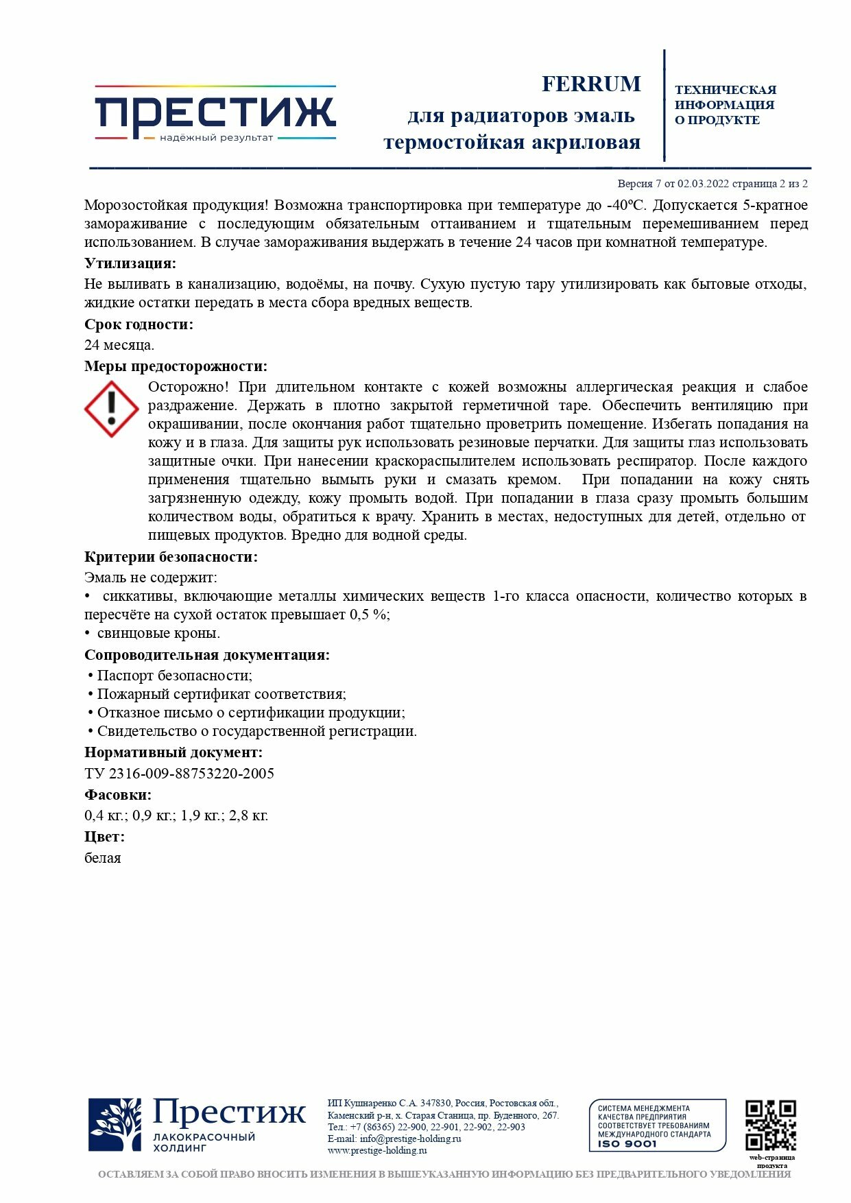 Эмаль акрил 1,9кг д/рад (белый) FERRUM 150° престиж