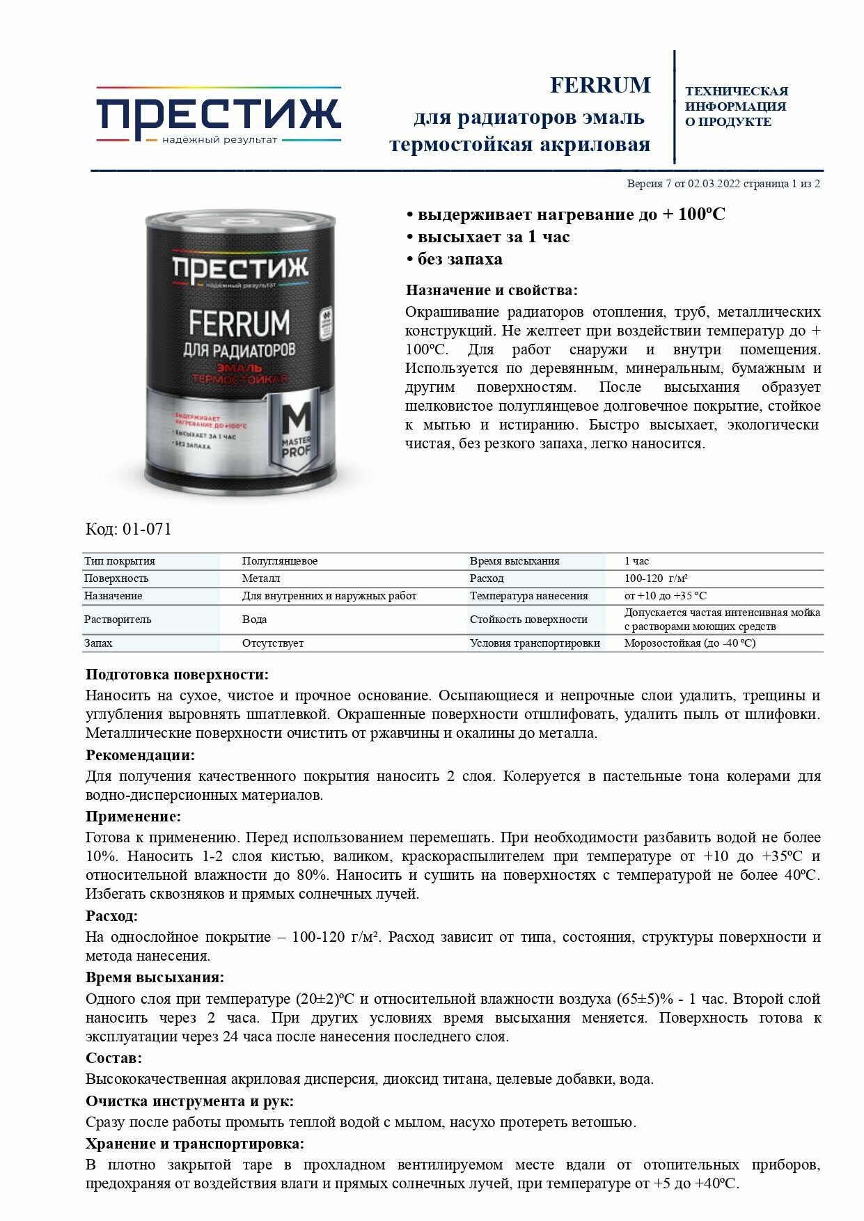 Эмаль для радиаторов термостойкая Престиж Ferrum, акриловая, глянцевая, белая, 0,9 кг