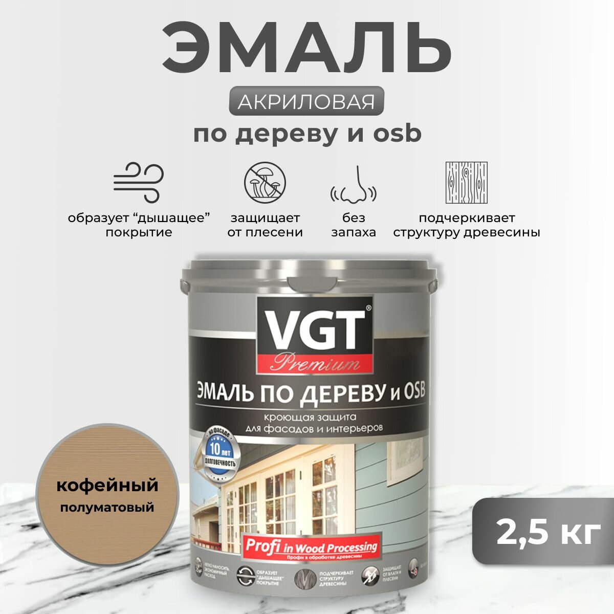 Эмаль по Дереву и OSB VGT Premium 2.5кг Кофейная ВД-АК-1179 Акриловая, Полуматовая для Внутренних и Наружных Работ / ВГТ Премиум.