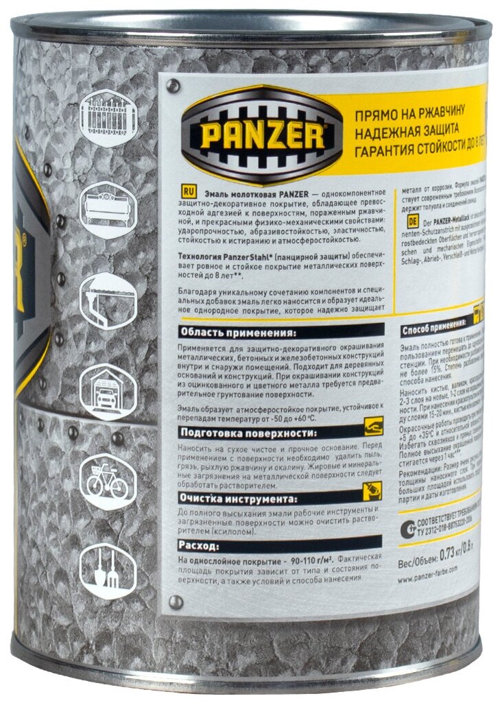 Эмаль универсальная Panzer, молотковая, 0,8 л, серая, 1шт, жестяная банка