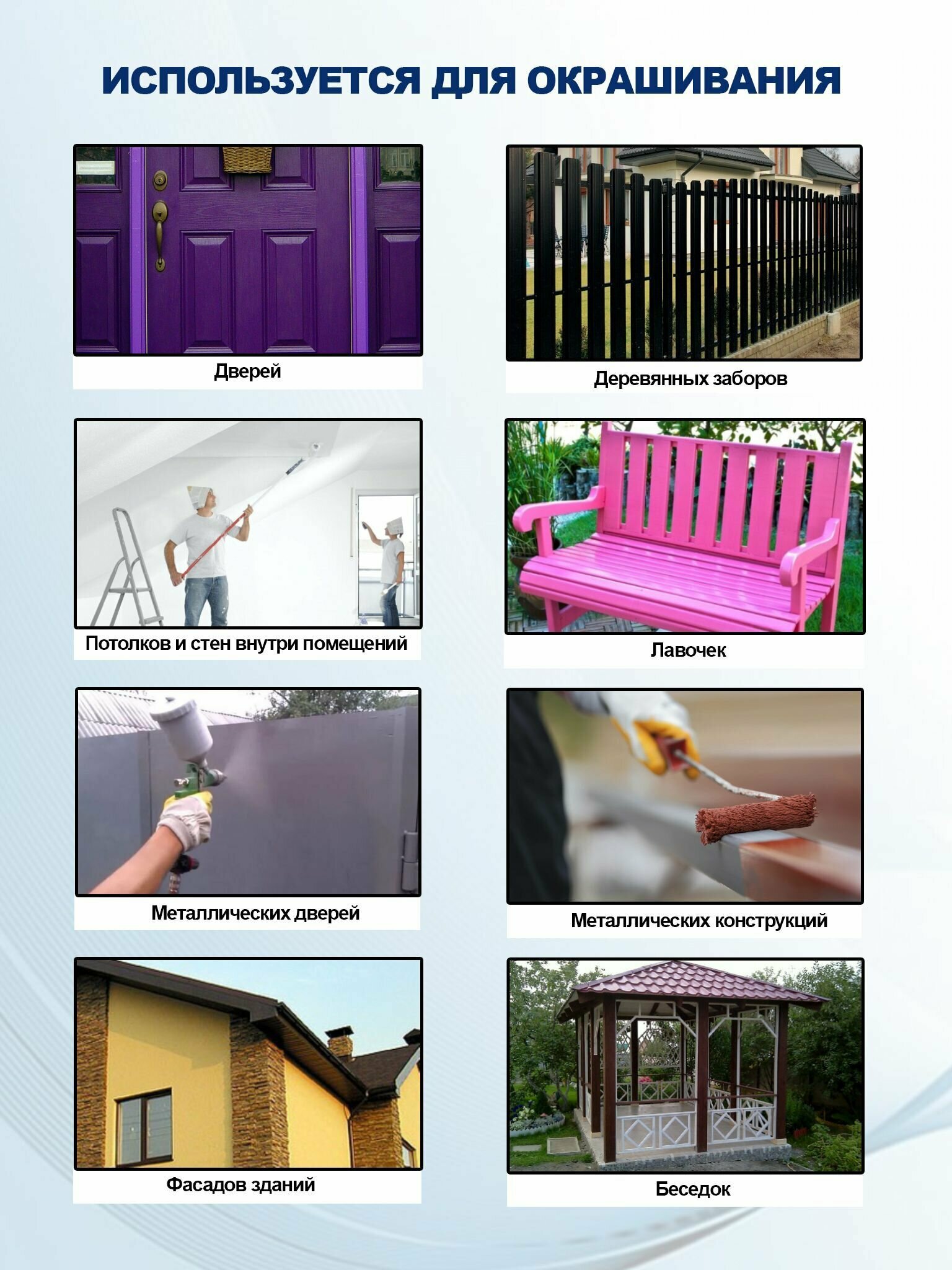 | Область применения | для гаражей / для дверей / для дымоходов / для каминов / для мебели / для окон / для перегородок / для печей / для подоконников / для пола / для потолков / для радиаторов / для садовой мебели / для стен / для ступеней / для фасадов / эмаль |