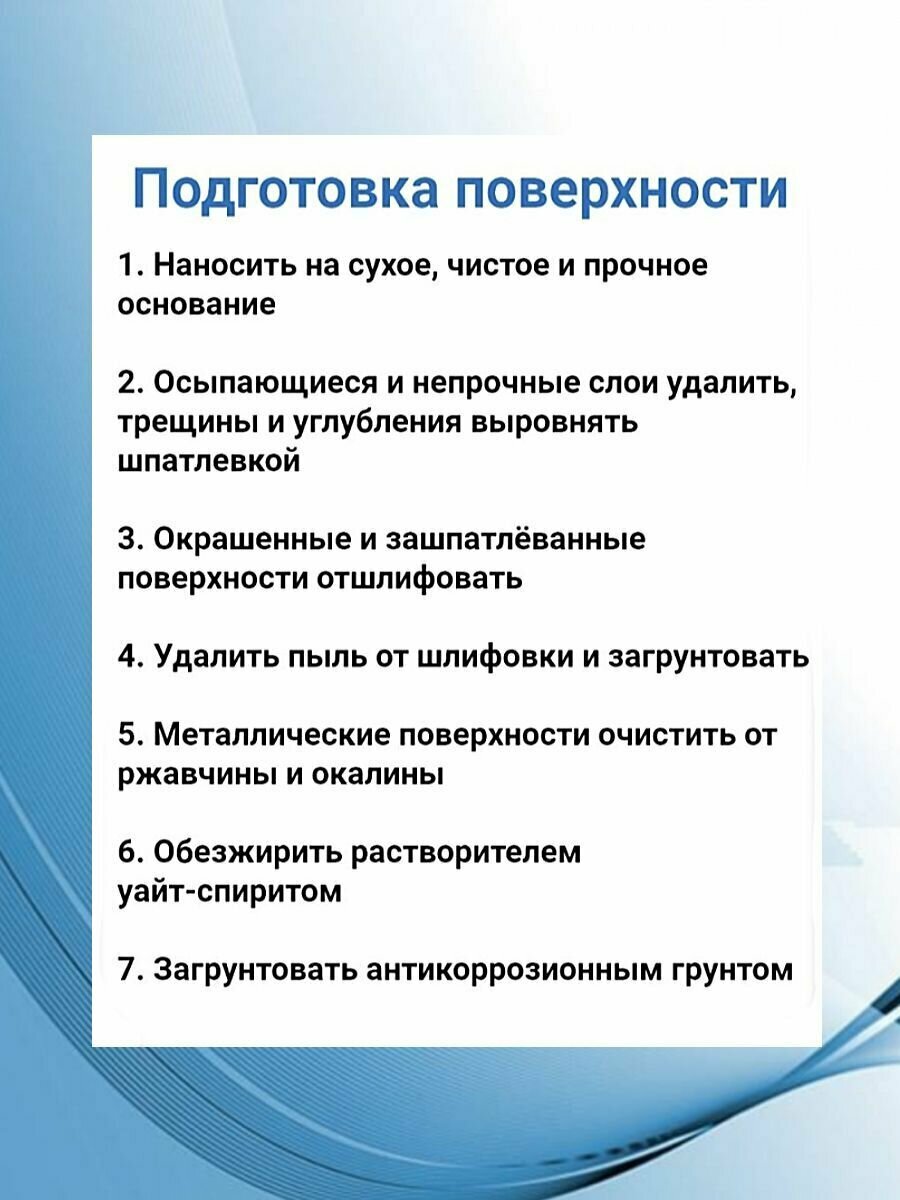 | Дополнительная информация | готова к применению, перед использованием перемешать, при необходимости разбавить уайт-спиритом или сольвентом не более 5%, наносить 1-2 слоя кистью, валиком, краскораспылителем при температуре от +5 до +35ºС и относительной влажности до 80% |